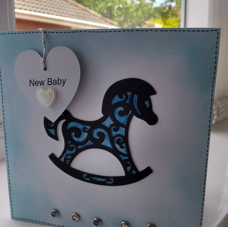 A completely handmade and uniquely designed card. Consisting of a rocking horse die cut from black card. Hand coloured and clear embossed to give the effect of stained glass. Finished off with crystal tags and a heart tag with new baby and pearl plastic heart.