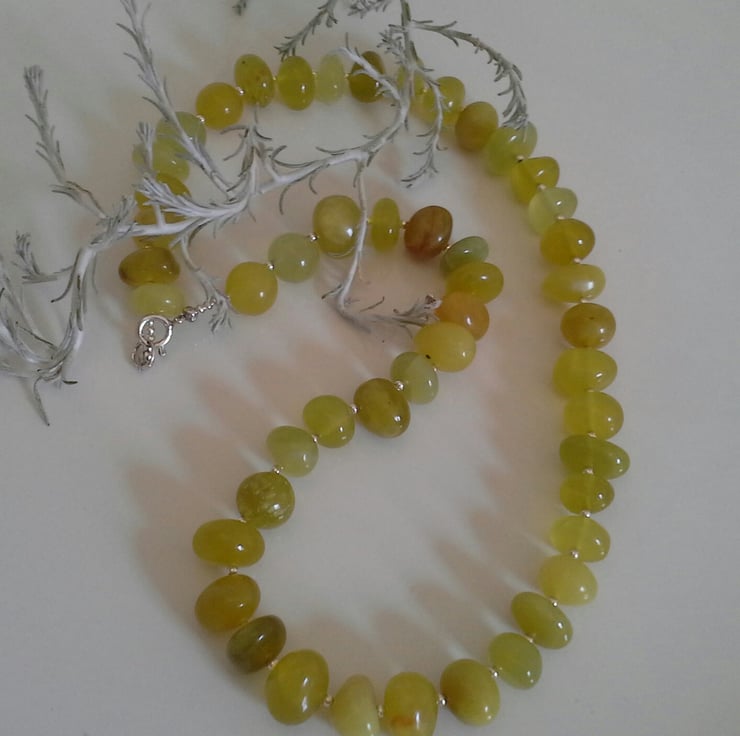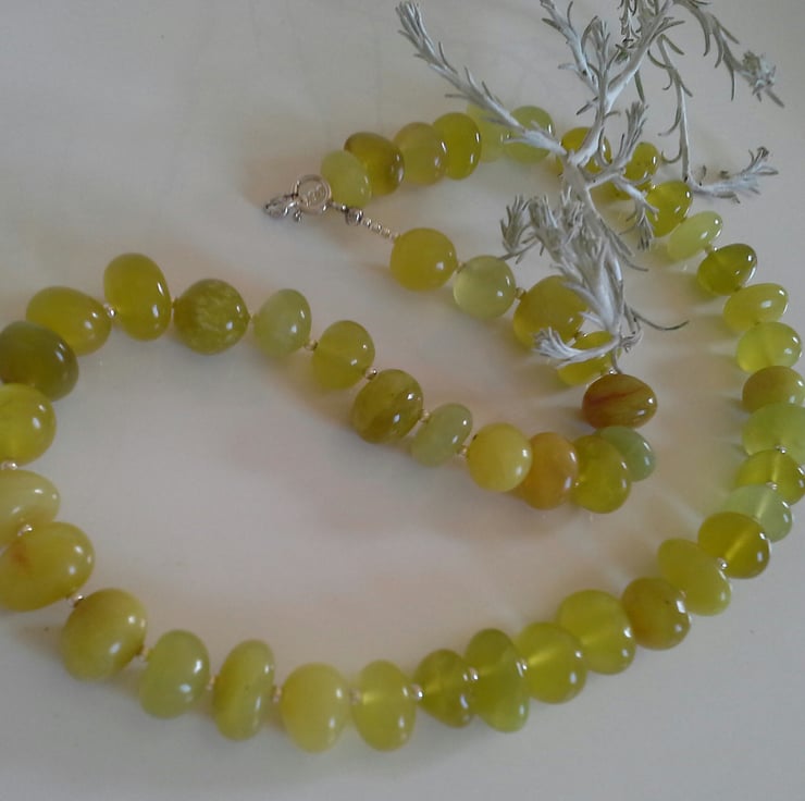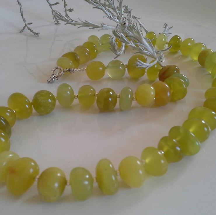 A rare opportunity to own a serpentine necklace designed and hand crafted by myself. Serpentine should have a good apple green colour with little or no dark brown or black inclusions. This necklace has been made from good quality irregular pebble cuts. Between each semi precious gemstone is a 2mm sterling silver spacer bead, complimented with a small sterling silver bolt ring clasp. For the main construction professional stainless steel jewellers has been used for added strength and lasting durability.