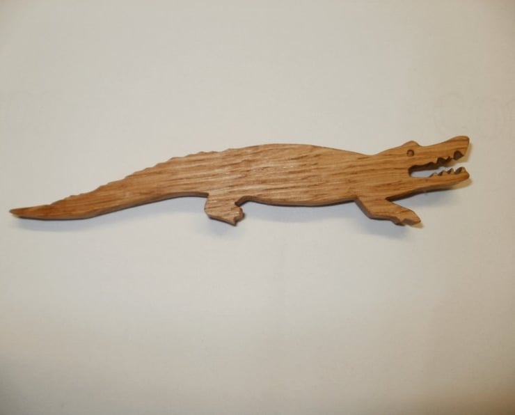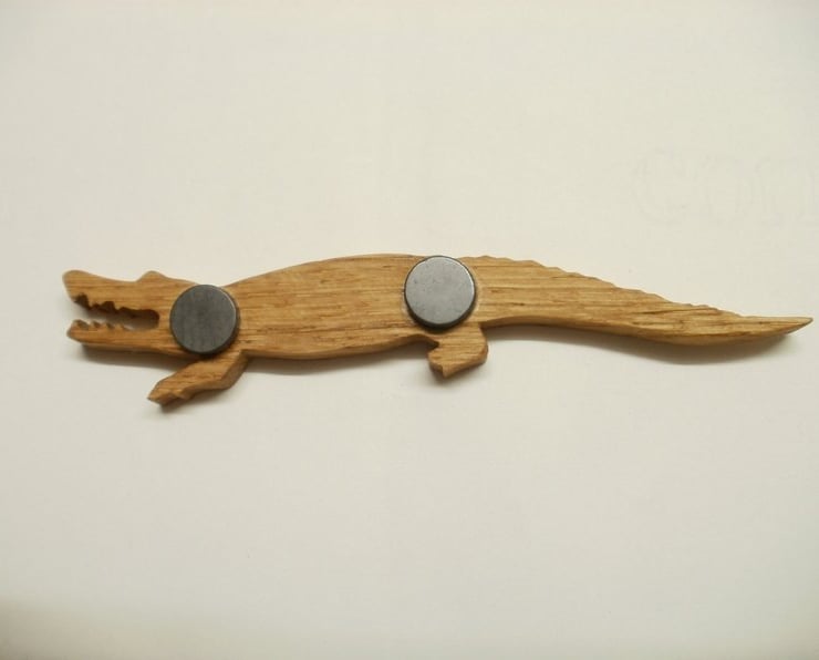 crocodile fridge magnet made from oak wood it is hand cut by me on a scroll saw then hand sanded then 2 round magnets glued on the back 2 coats of danish oil finish to keep it looking good