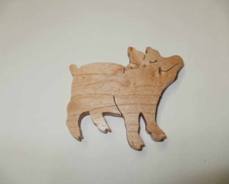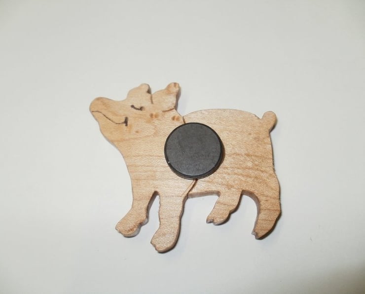 pig fridge magnet wood here we have a hand cut by me on a scroll saw pig fridge magnet it is made from maple and has a round magnet glued on the back and has a danish oil finish on it to bring out the natural colours in the wood then a wax polish on top to keep it looking good