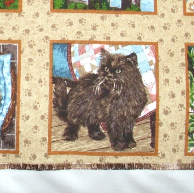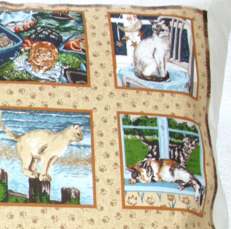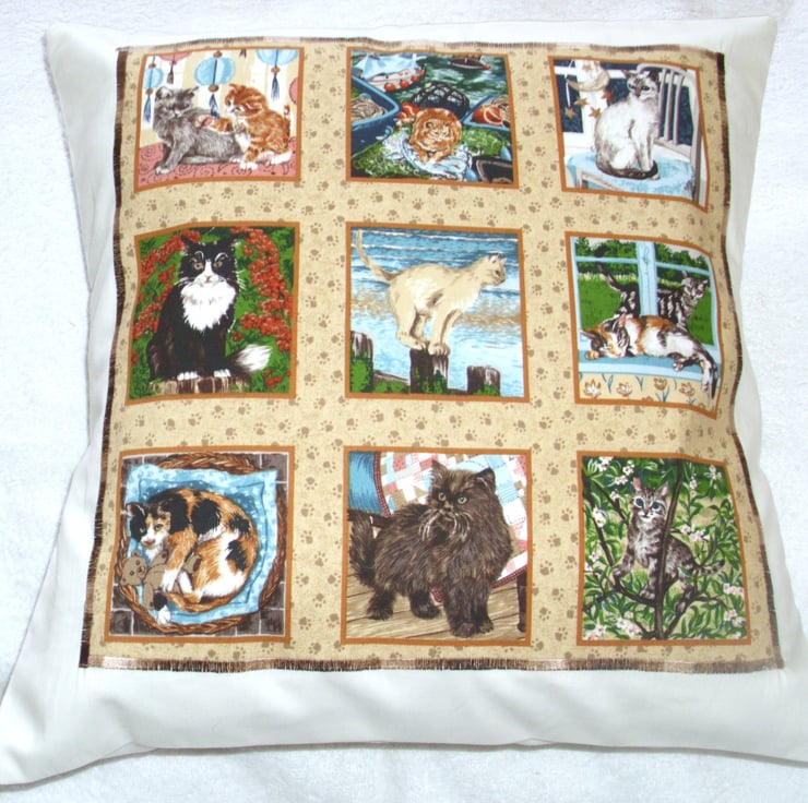Cats , Cats, Cats cushio with cats in squares, black and white fluffy cat, black kitten standung on chair, ginger tabby cat asleep on fishing nets, grey and ginger tabby kittens playing, white cat leaping along a fence, pretty kitty up a tree, tortoiseshell cat curled up in her basket, kittens asleep on the window sill and a lovely siamese sitting on a chair.