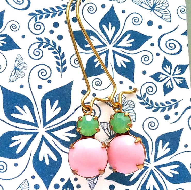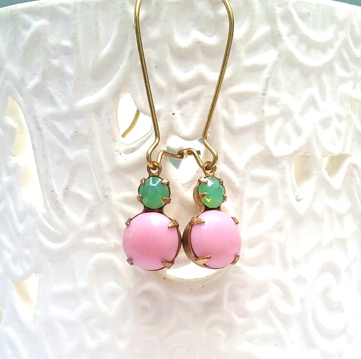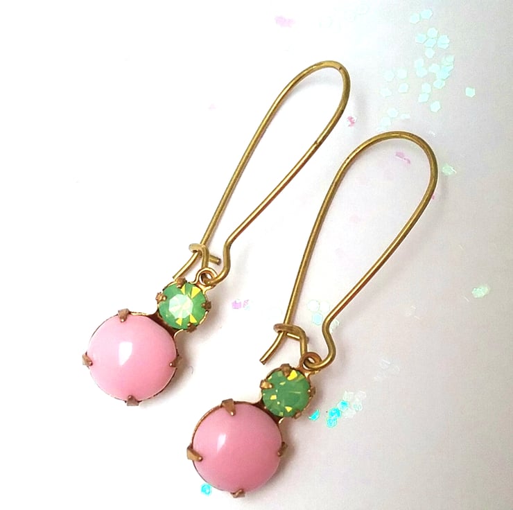 Gorgeous vintage glass earrings pastel pink and opal green glass gems set into