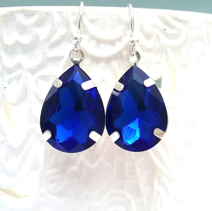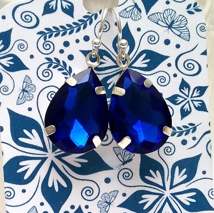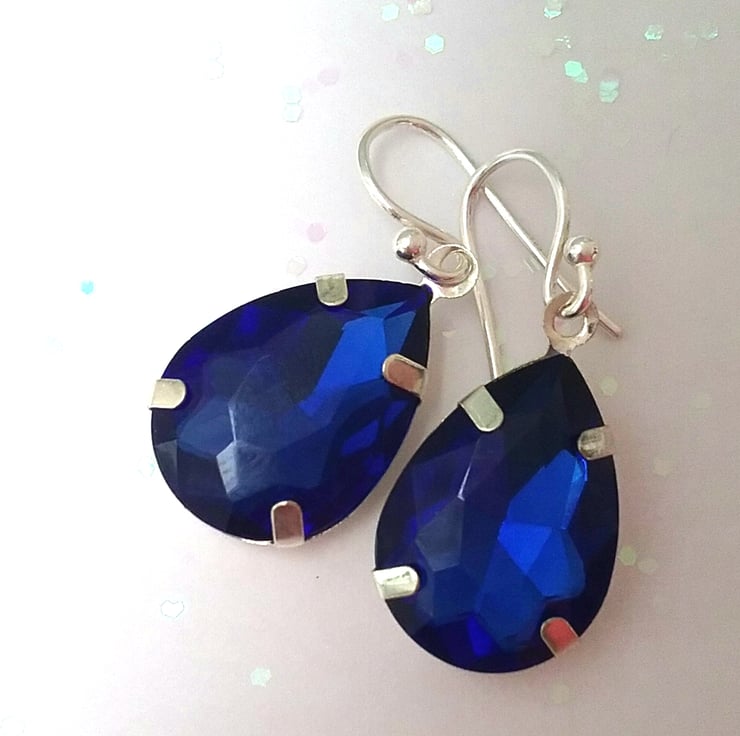 Gorgeous teardrop vintage blue glass earrings set into light weight silver settings all which from silver ear wires.