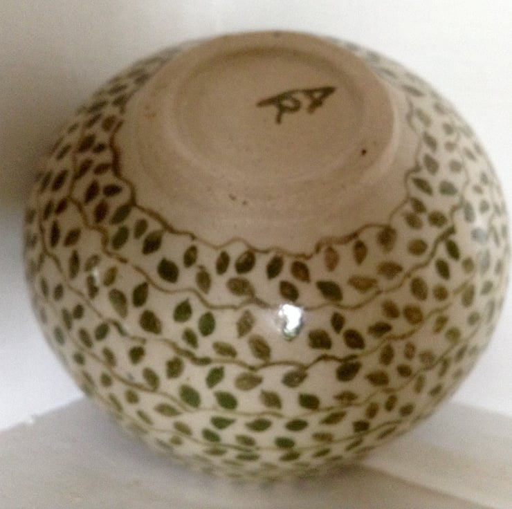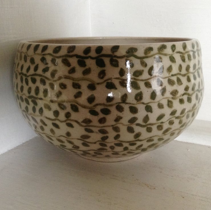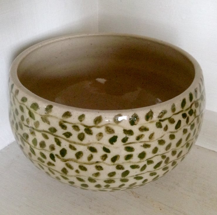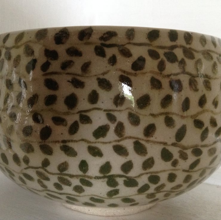 Beautiful handthrown stoneware soup or cereal bowl with an intricate hand painted circular leaf decoration in green. The bowl measures 14 cms across and is 8 cms high and is tough and durable and microwave and dishwasher safe. It holds about half a litre.