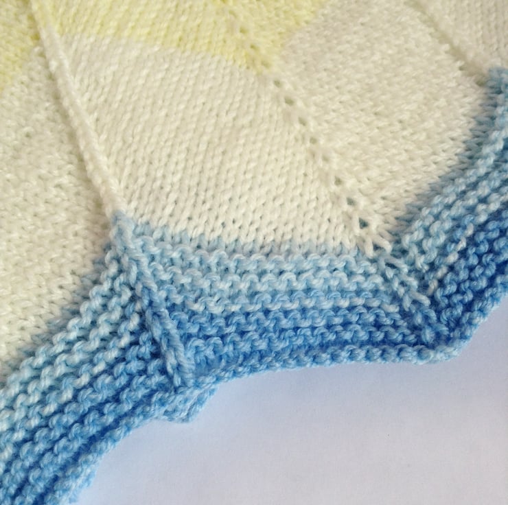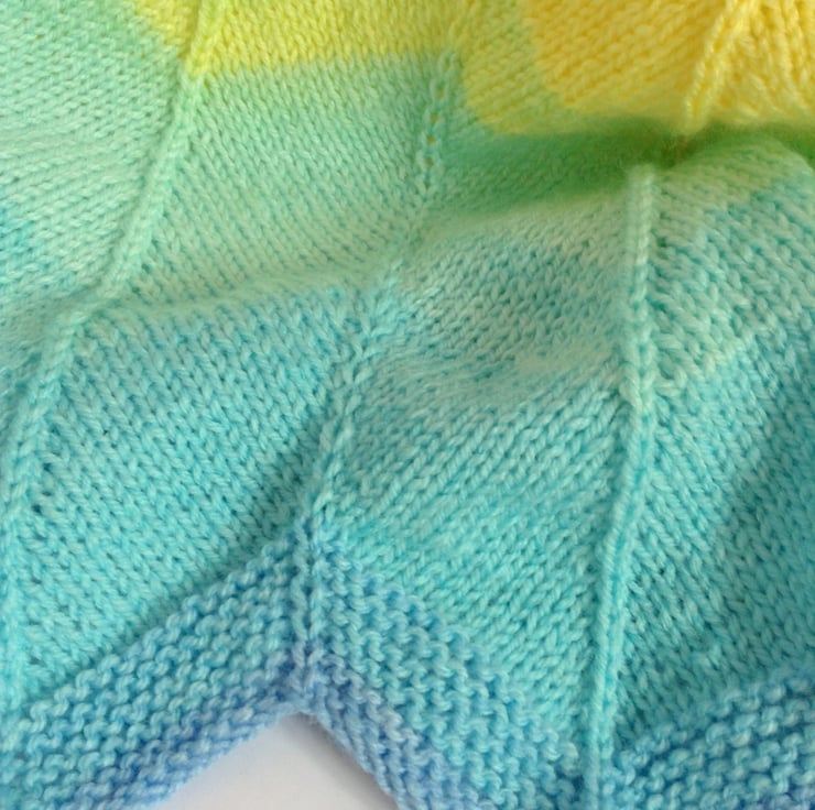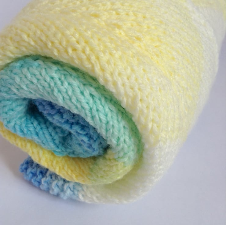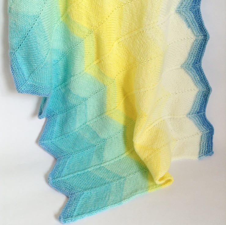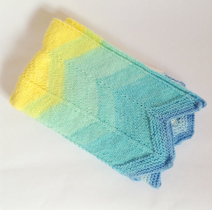 Made using a chevron style pattern, this blanket has lovely shades of blue and yellow which make me think of sandy beaches and turquoise seas.