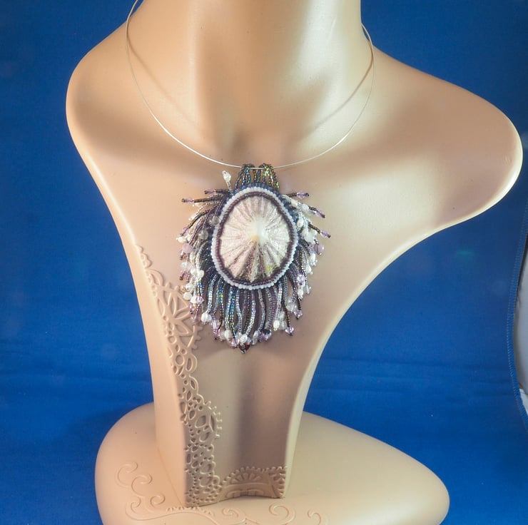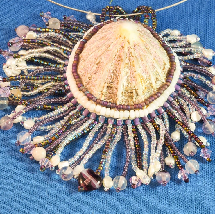 I made a few of these a while ago, starting with a long hollow shell someone gave me, it struck me that the hollow in the shell was wasted if I just closed it up as usual. I found the locket frames on a website which solved the problem for me. I found this lovely purplish shell recently so I decided to make another one. The others have always had very simple edges but I decided this time to go for the full stranded fringe.