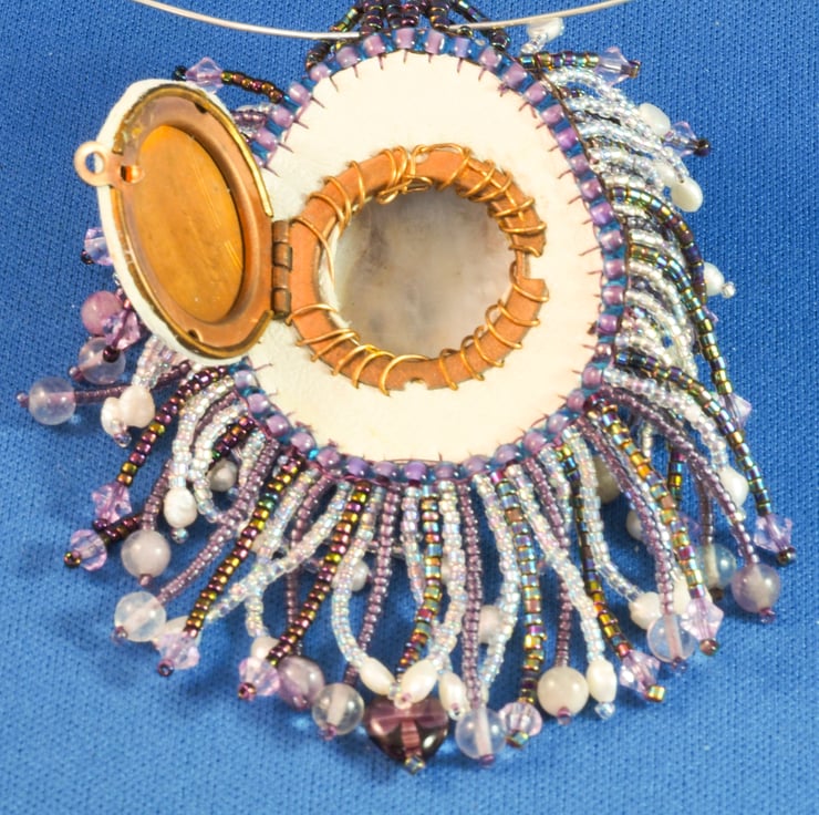 Locket made from a natural Limpet shell and vintage and modern beads. The pendant is created by beading around the limpet to create a mount for it, The piece is backed with leather and a copper effect locket frame stitched into the backing and leather with fine copper wire. leather is glued to the back of the locket to match the backing.