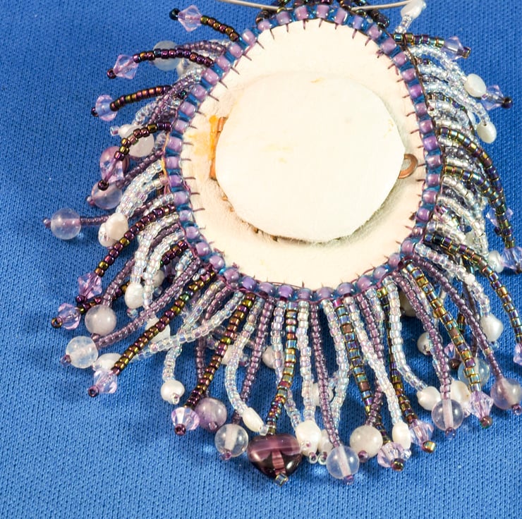Strands of seed beads are attached to the edge, finished with old mauve bicone crystals, flourite beads and recycled baroque pearls, the central strand is finished with a purple striped, heart shaped bead.