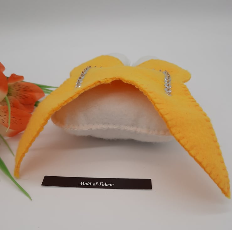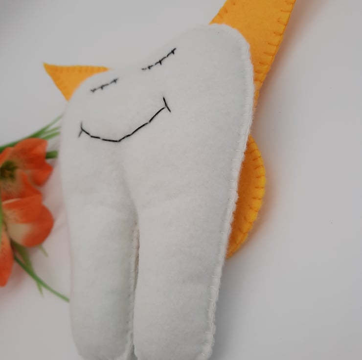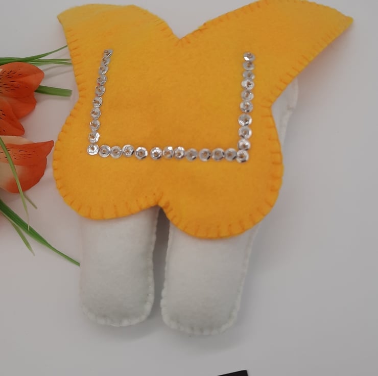 Made using felt. A pocket has been made on the back of the wings using silver sequins and silver seed beads big enough to fit a tooth and fairy present.