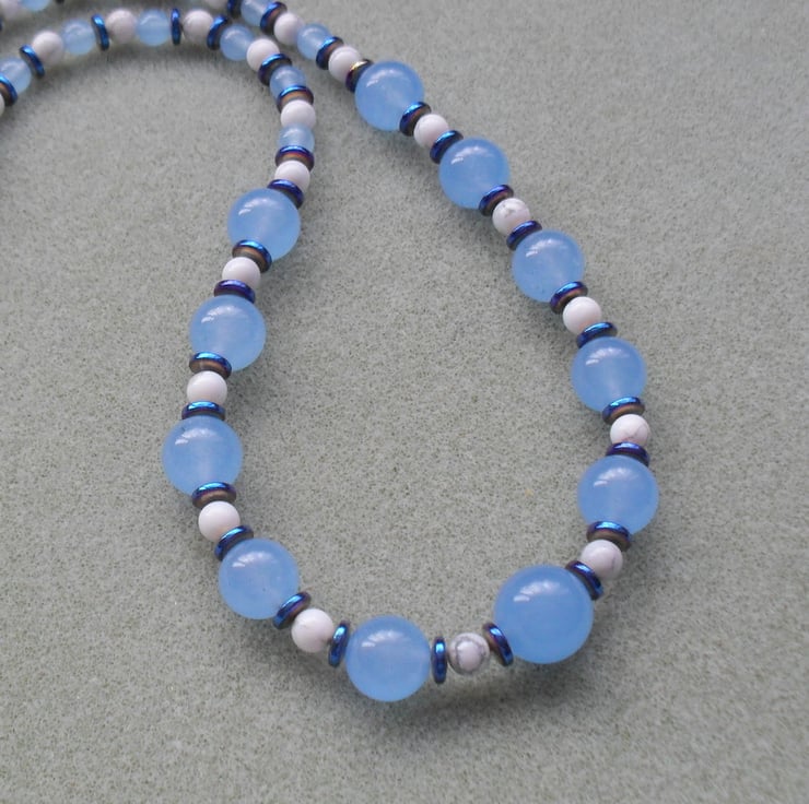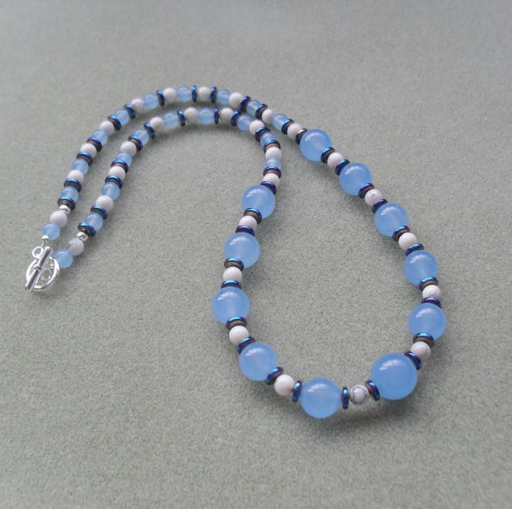 Blue dyed quartz,blue coated haematite and howlite semi precious gemstones are beaded onto beading wire and attached to a silver plated toggle clasp