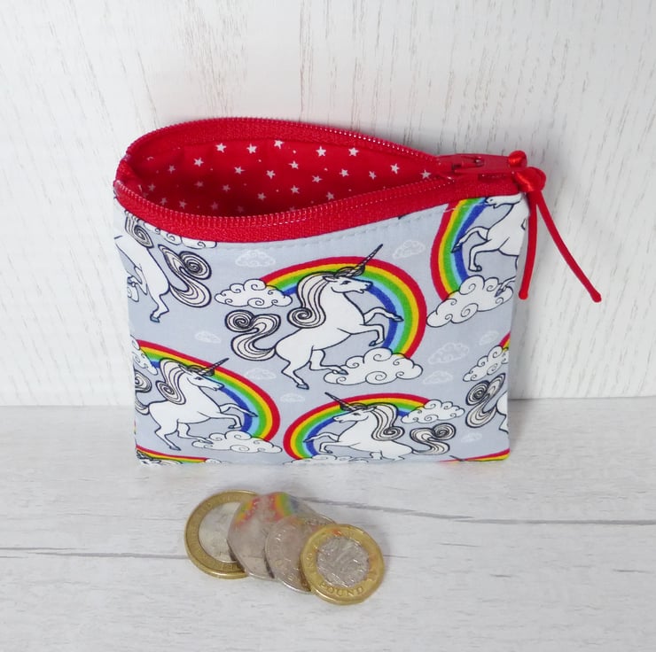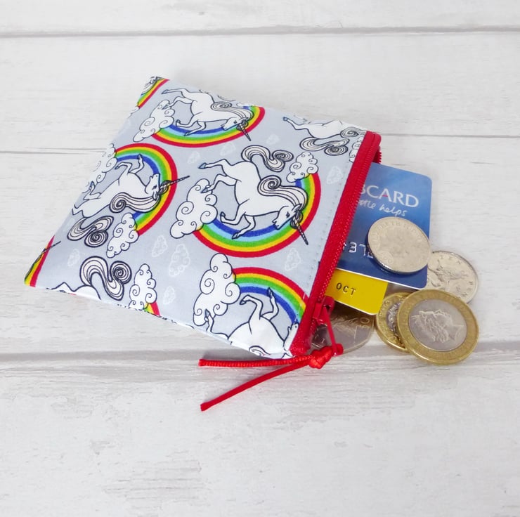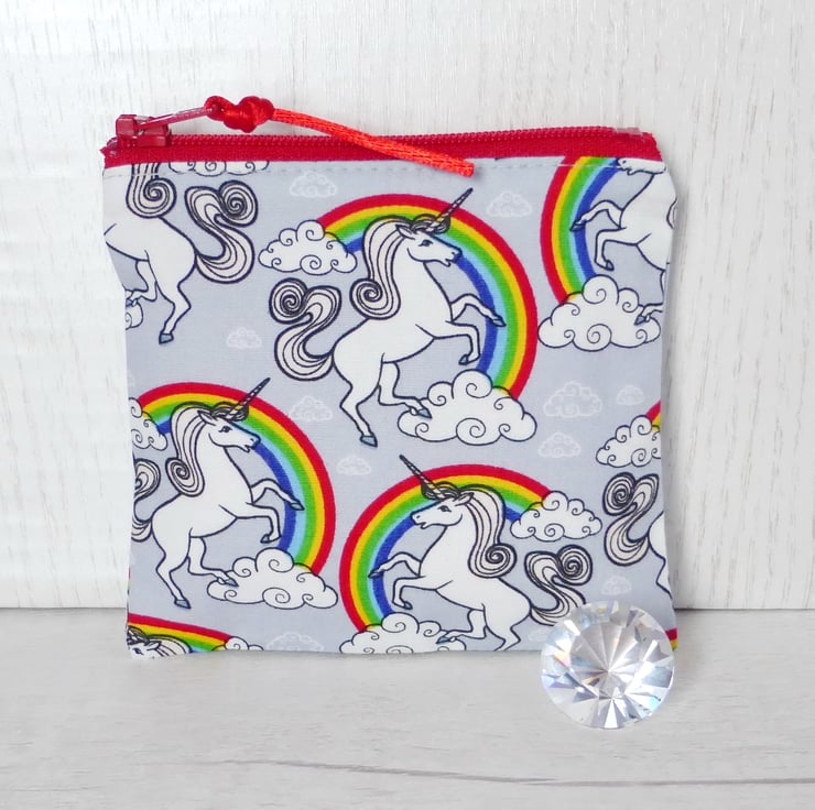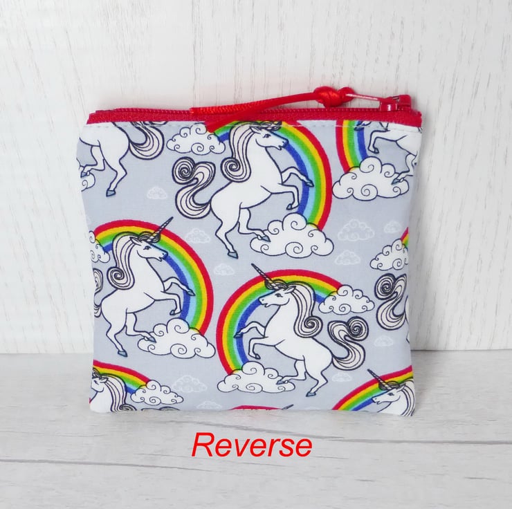A small coin purse made of 100% cotton fabric with a unicorns and rainbows design on a light grey background.