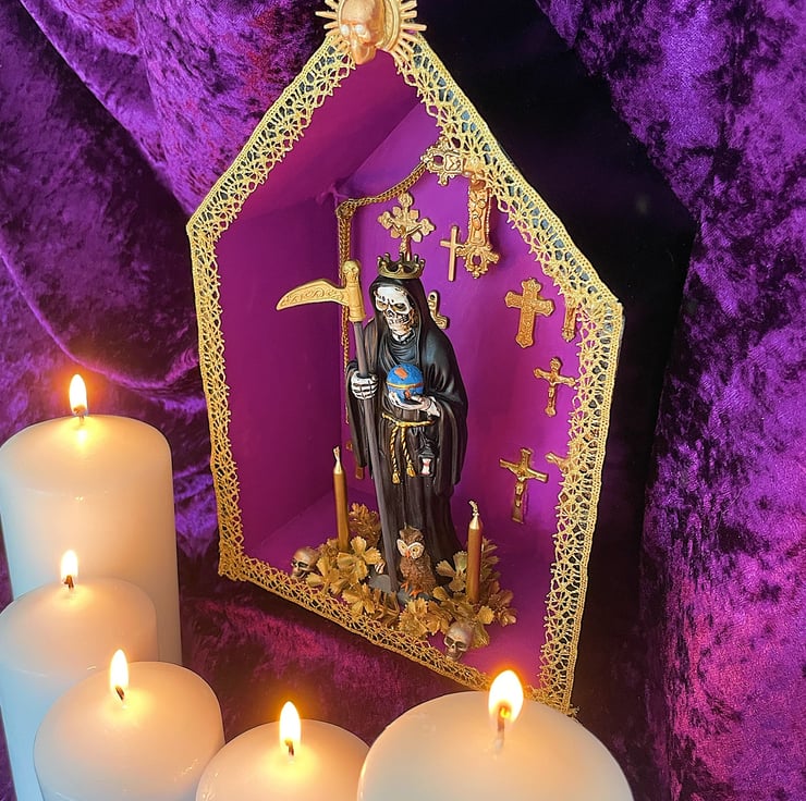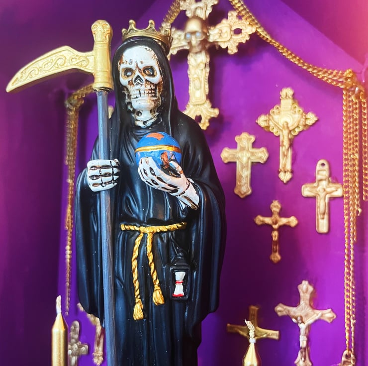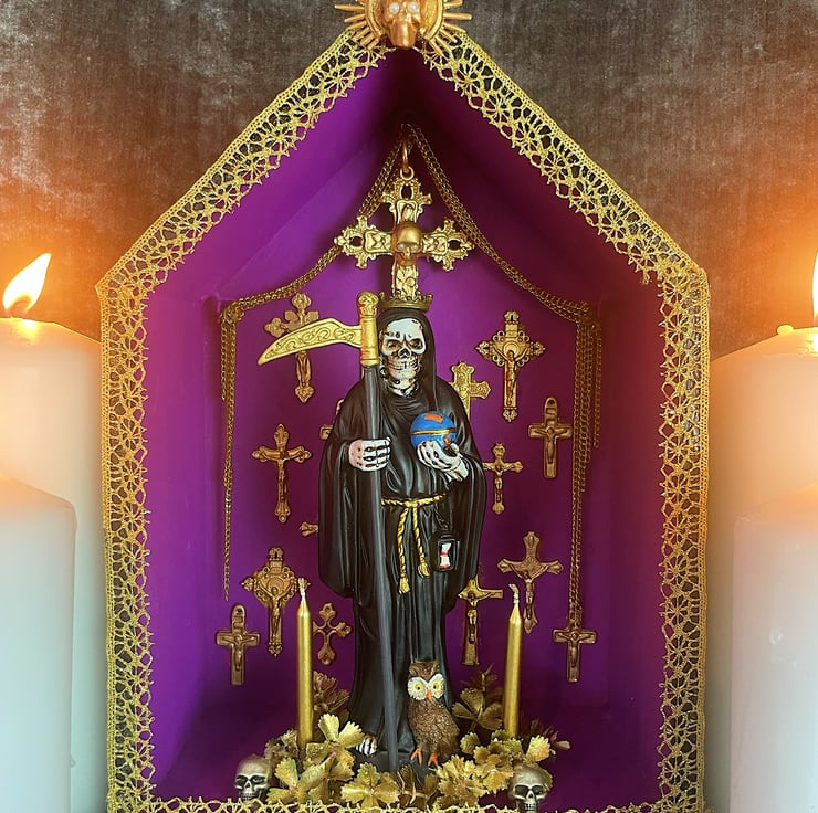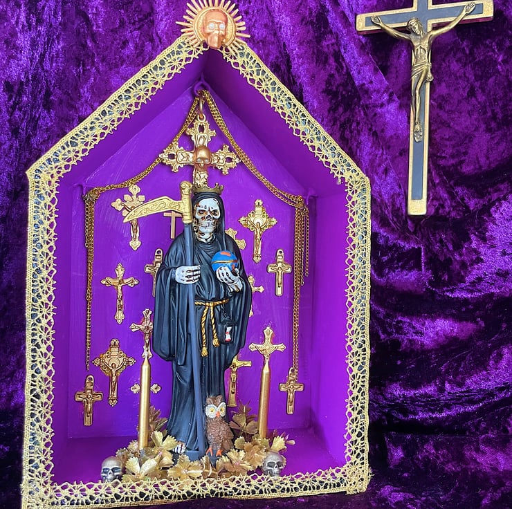 Gothic folk art altarpiece featuring a Holy Death Santa Muerte statute that is from Mexico