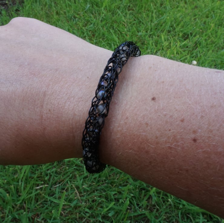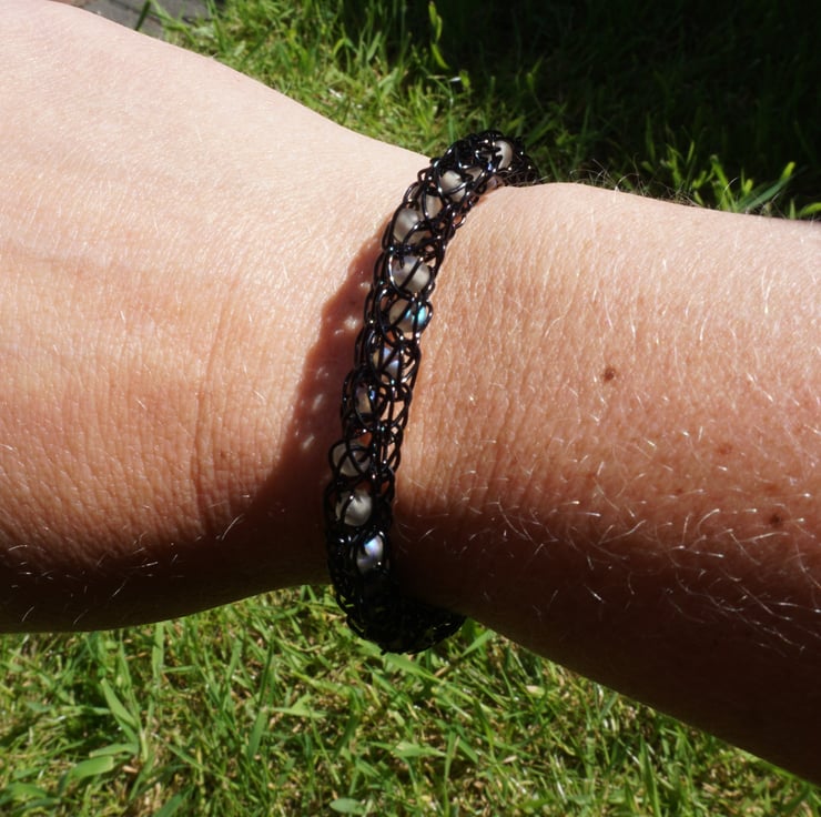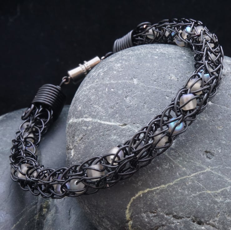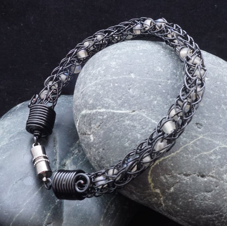 This striking bracelet has been made with black enamelled copper wire using the iking knit technique. I've added 4mm round glass beads into the chain at intervals - the beads are frosted & grey, some with odd patches of iridescence that flash blue. The pale beads spiral through the black chain, looking almost ghostly within the wire!