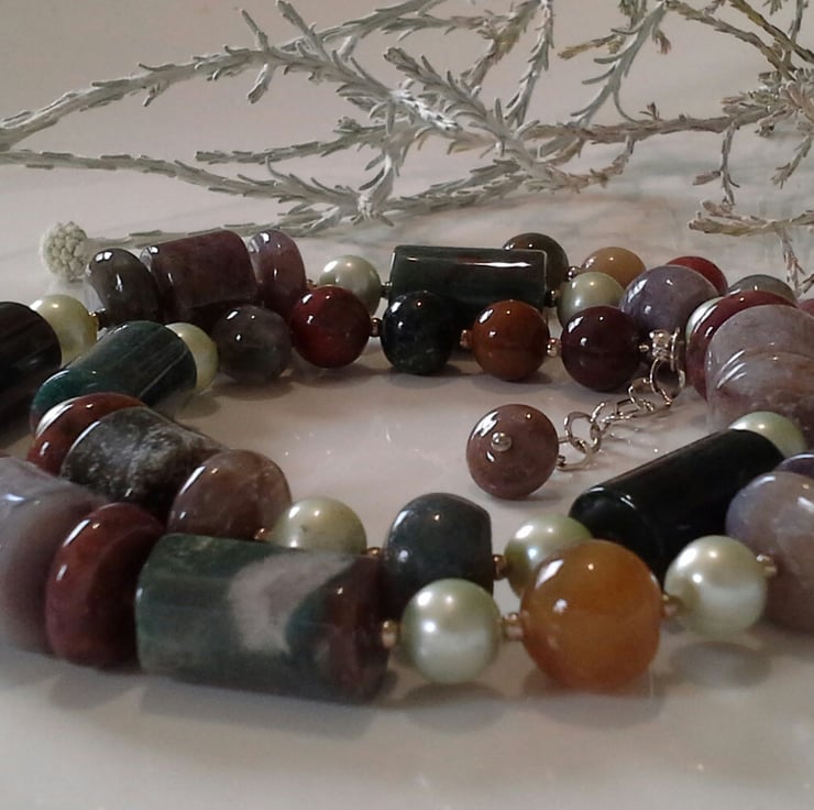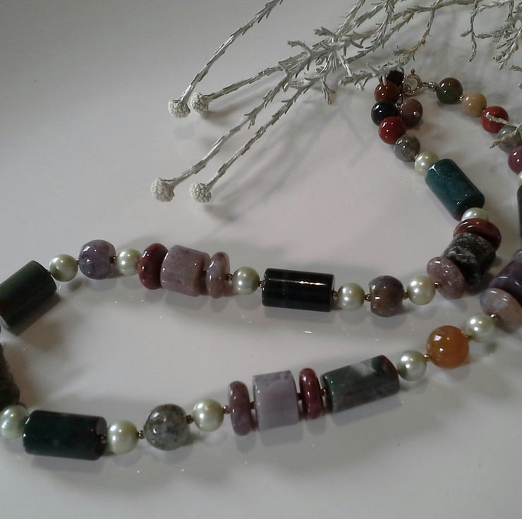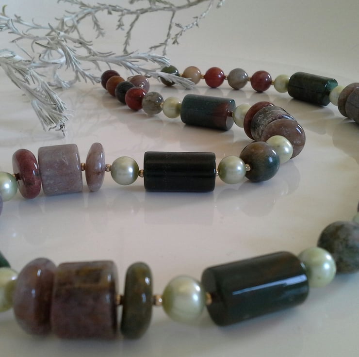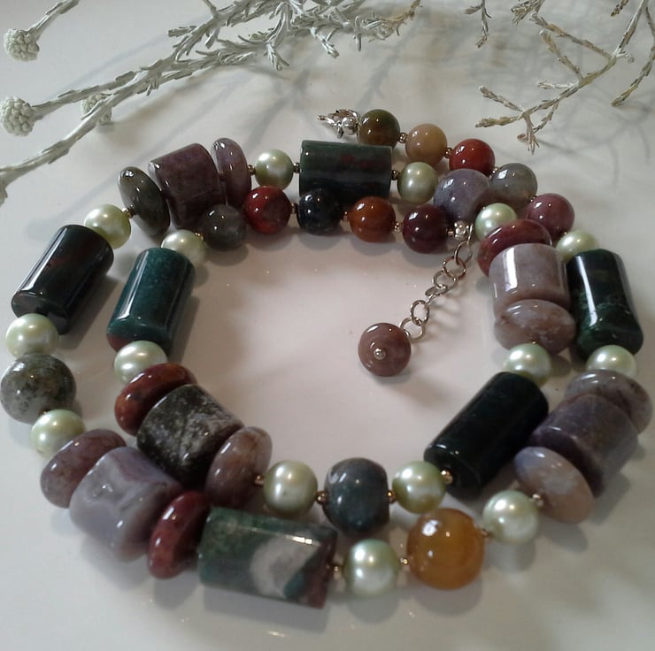 A fabulous statement necklace designed and hand crafted using a verity of mixed cuts semi precious fancy jasper and mint coloured freshwater culture pearls. Between every genuine gemstone are 2mm sterling silver spacer beads. For the main construction professional stainless steel jewellers wire has been used for added strength and lasting durability, finished off with a 925 sterling silver extender chain and bolt ring clasp.