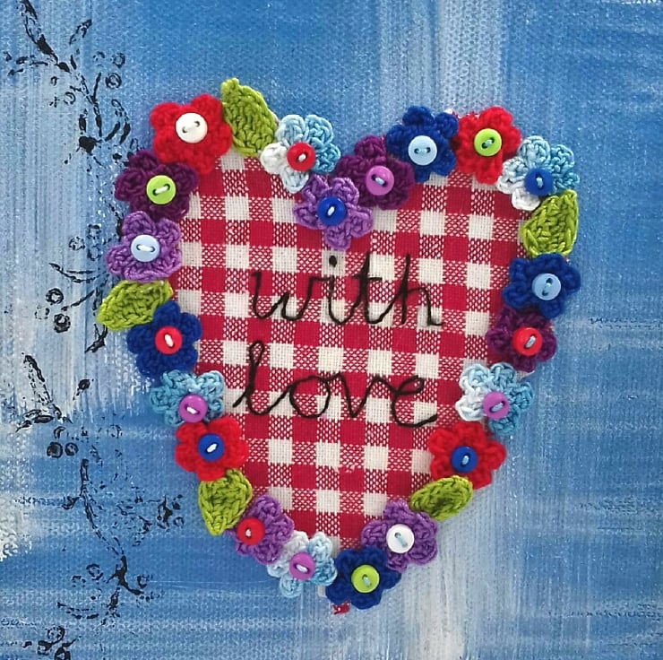 The canvas has been painted and printed in acrylic. The fabric heart is embroidered with the words 'with love ' and tiny crochet flowers and leaves have been sewn around it. The centre of each bloom is a miniature button.