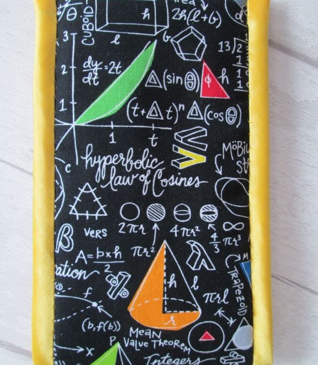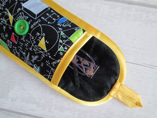 The perfect glasses or phone case for a mathematician, maths teacher or scientist, plain black cotton printed with all sorts of mathematical and geometric sums and formulae. It's lined with black cotton, lightly wadded to protect the contents and finished with yellow bias binding and a green button. Will take most pairs of glasses, phones up to 15 cm x 7.5 cm x 1 cm and could also be used for pens/pencils, a camera etc.
