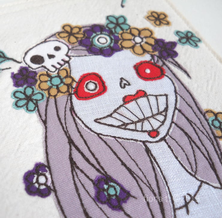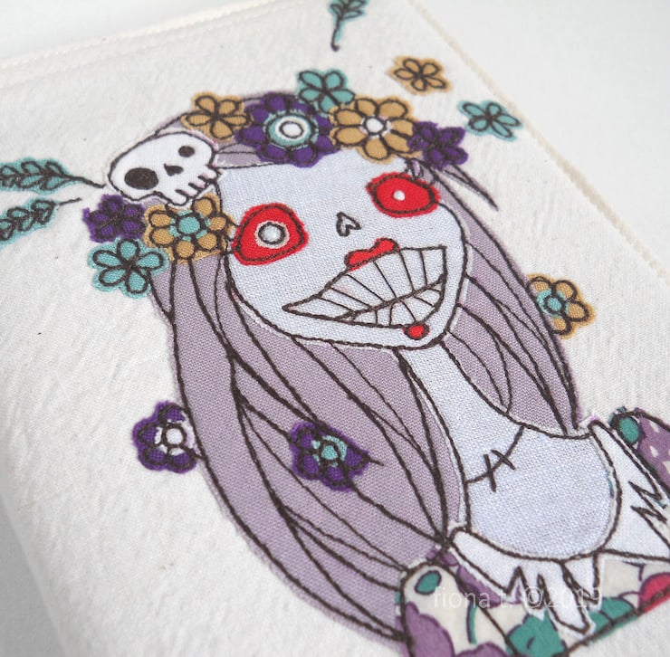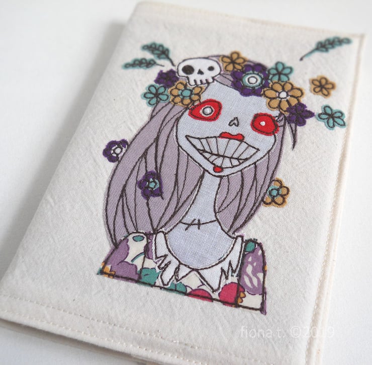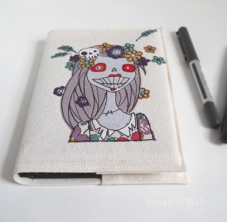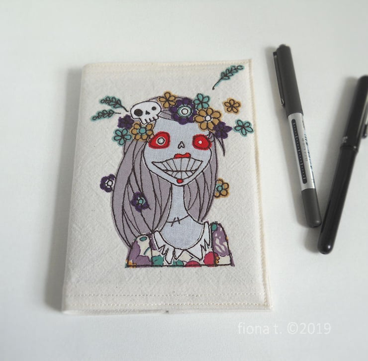 applique & freehand embroidered flower crown zombie lady notebook cover with A6 sketchbook inside.