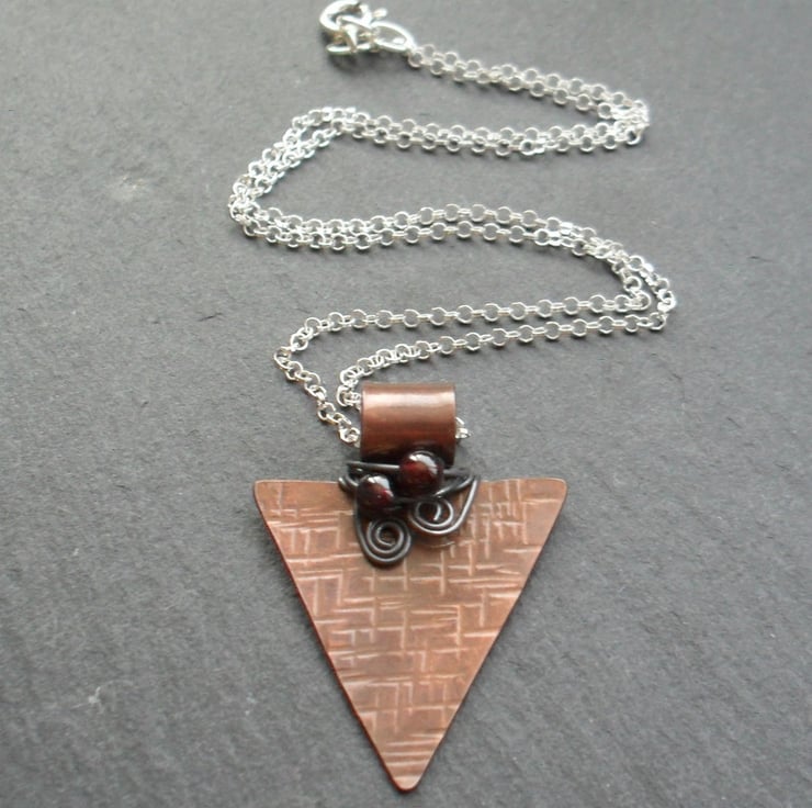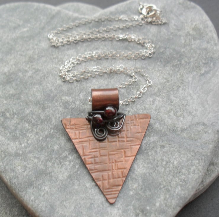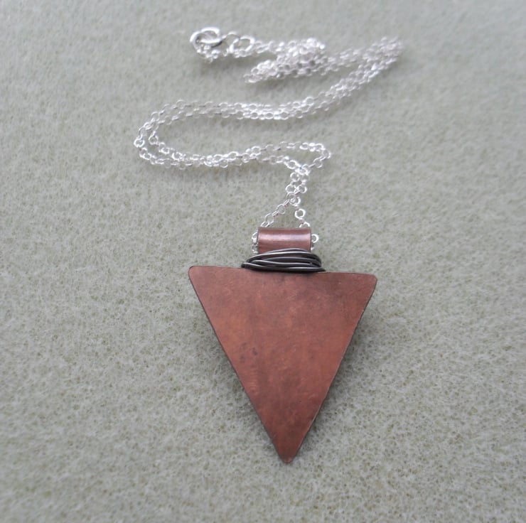 Copper triangle shaped pendant which has been cut from a sheet of copper then the pendant has been ,sanded, hammered to give texture, oxidised to give a aged look. the copper then has had a coat of lacquer to help protect the petina