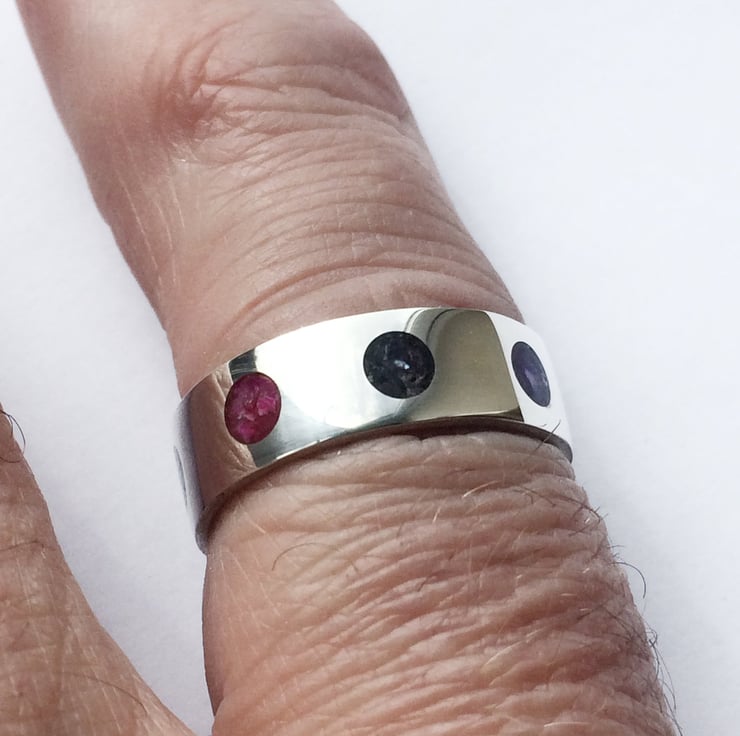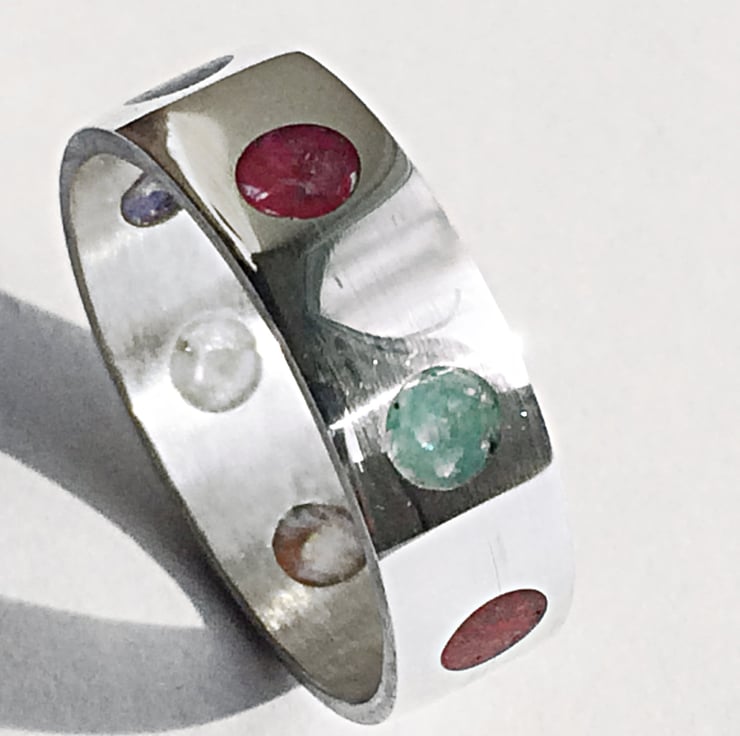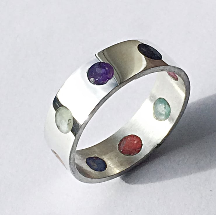 Having made a small number of Channel Inlay rings I was intrigued whether it was possible to do a multi-coloured ring while keeping it aesthetically pleasing. I set about experimenting and came up with this Rainbow Dots Ring. It can of course be ordered in a single Colour of Dots if that is your preference.