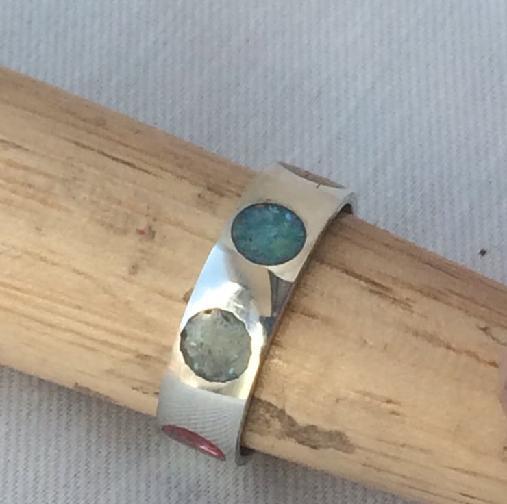 This ring is made individually to your personal size, it is not from stock, so may take up to 5 days to dispatch. Choose your normal ring size from the drop down box. (It will be made a quarter size larger to allow for the Ring band width.) If you have specific colour preferences or repeats of a particular colour, please message at time of order or immediately after stating your preferred configuration of colours.