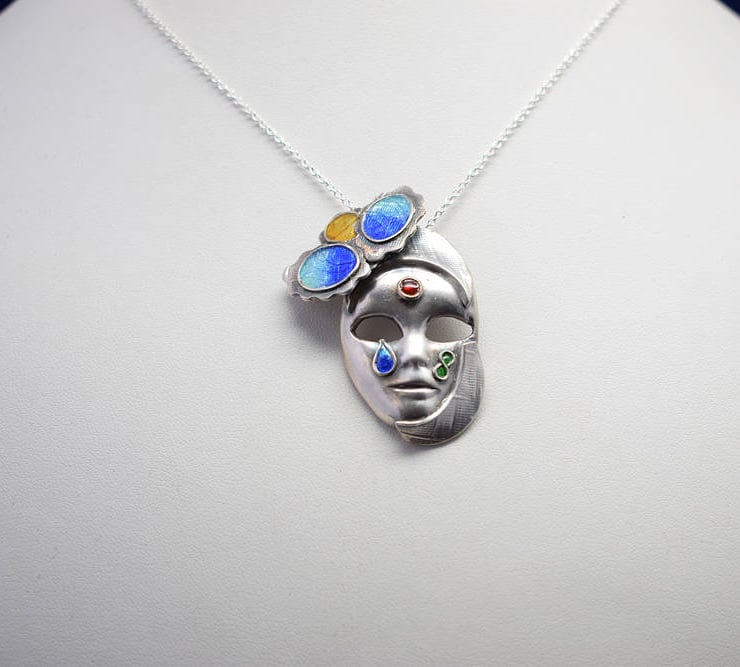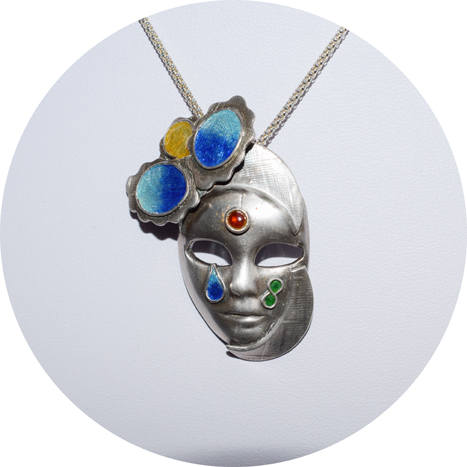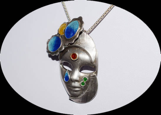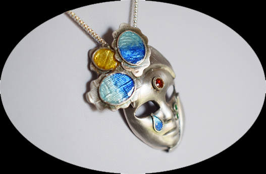 Having made a few small pieces of Fine Silver (.999) using Silver Clay, I took an online class to discover new techniques and develop the art of Enamelling on Fine Silver As the tutorial moved through the processes I began to developer ideas about how I could personalise a Venetian Mask and at the same time learn the art of enamelling. This unusualpiece was the result and in fact the only Venetian Mask I have made.