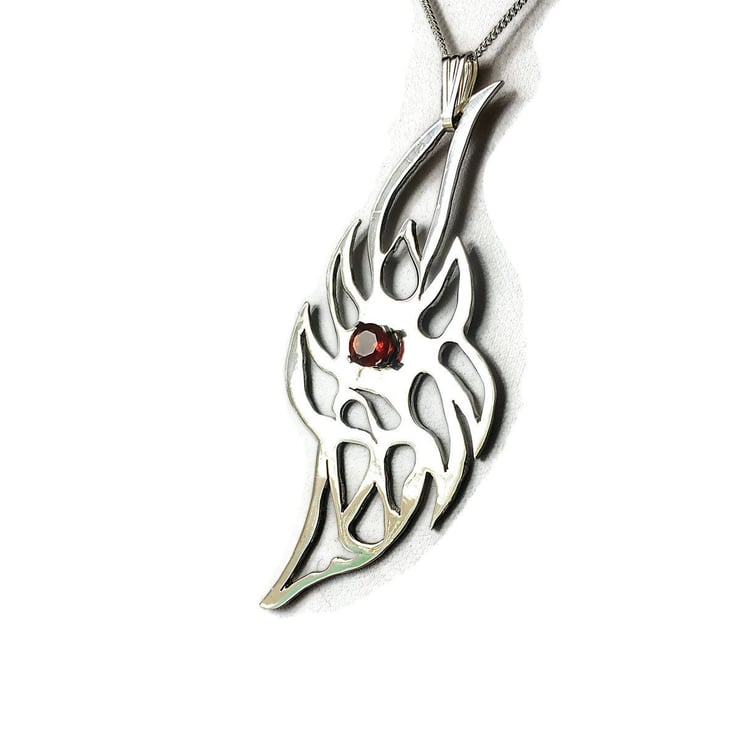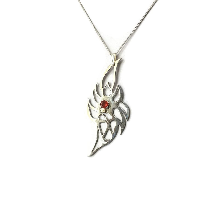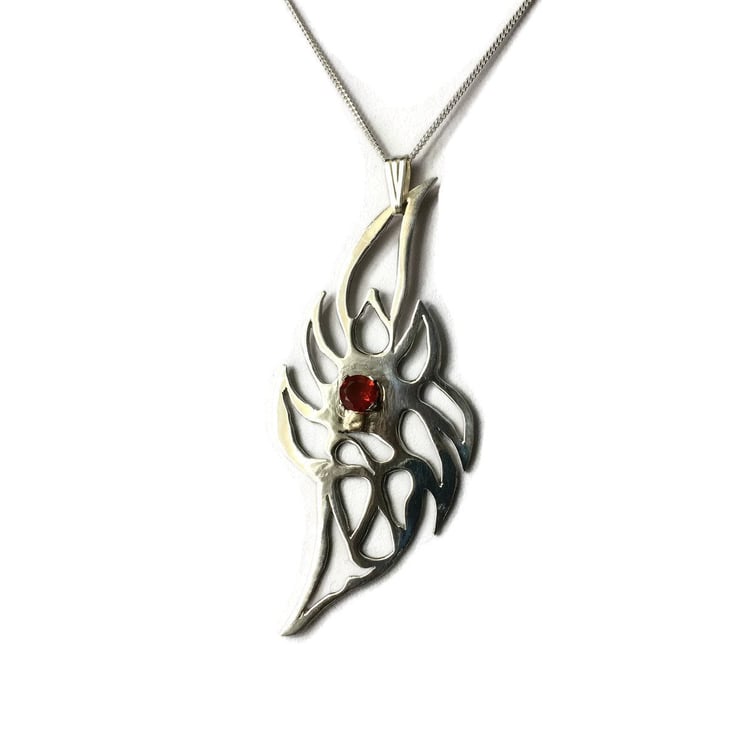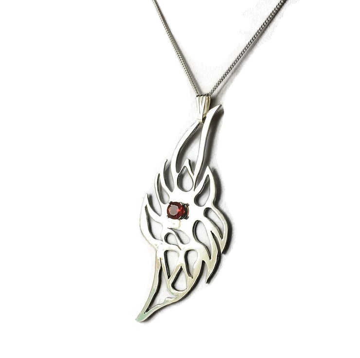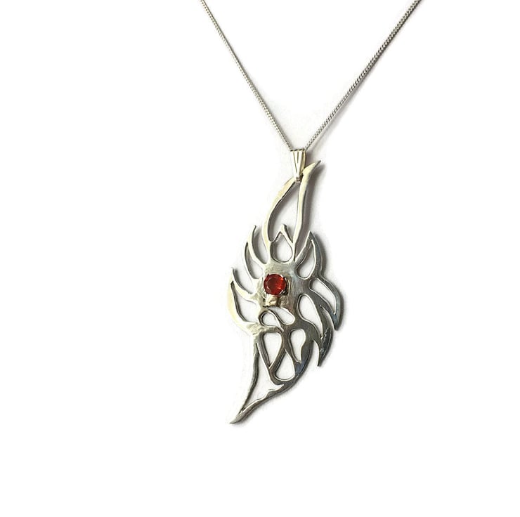The Mexican Fire Opal Sterling Silver Flame has a Genuine Mexican Fire Opal claw set in its centre around a hand pierced silver flame. Movement is created by a loose silver Bail hanging from a Sterling Silver Chain. The reverse of the piece bears the Hallmark for Sterling Silver from the Sheffield Assay Office.