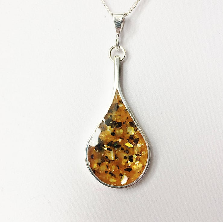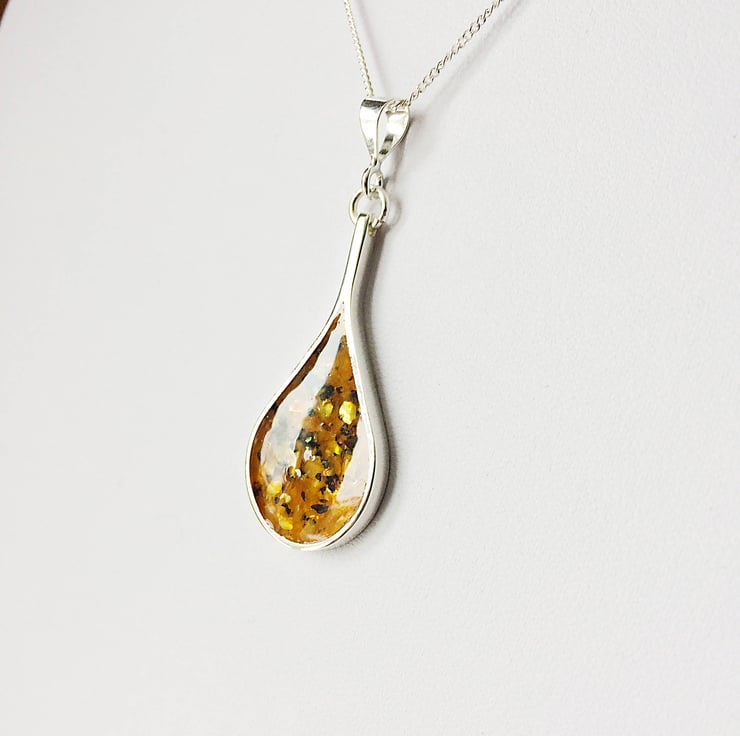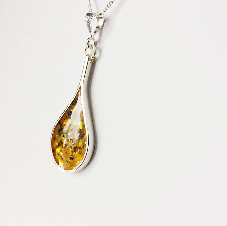 Made in Sterling Silver, this handcrafted Yellow and Black Shell Teardrop Necklace hangs beautifully on a sterling silver Bail from a Sterling Chain. The Shell is encased in jewellery grade resin and finished to a high polish which will attract attention just by being worn. This pendant can be set to the reverse with Memorial ashes (as in picture 4) to provide a beautiful subtle commemorative piece. (Please ask for further details). The size of the Teardrop is 40mm x19mm.