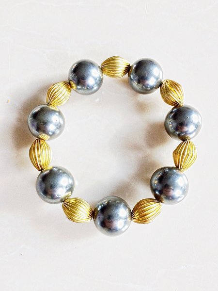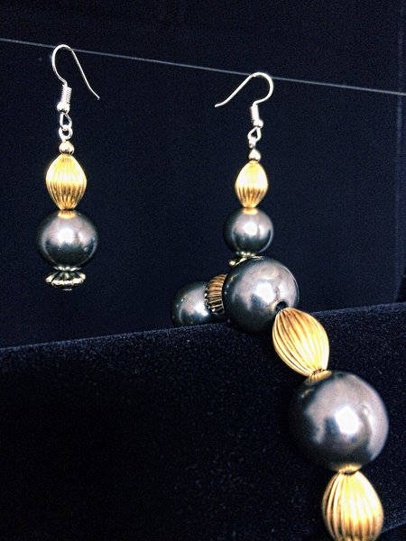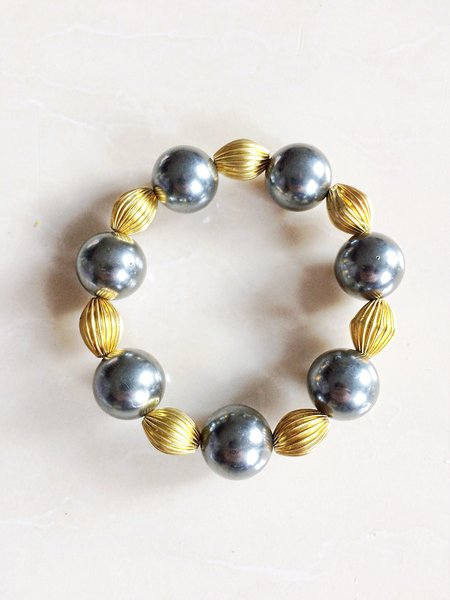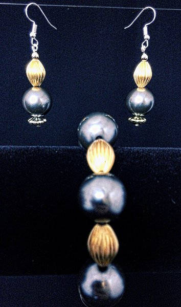 A lovely visually striking Beaded Bracelet in Chunky Grey and Ribbed Brass Bead Design with. Matching pair of very light earrings. The Large Grey metallic Beads are separated and complimented by the ribbed gold coloured beds in forming this Elegant Chunky Stretch Bracelet. The beads are strung on durable stretch cord to fit a 7 to 8 inch wrist comfortably. Lovely colours and comfortable to wear.