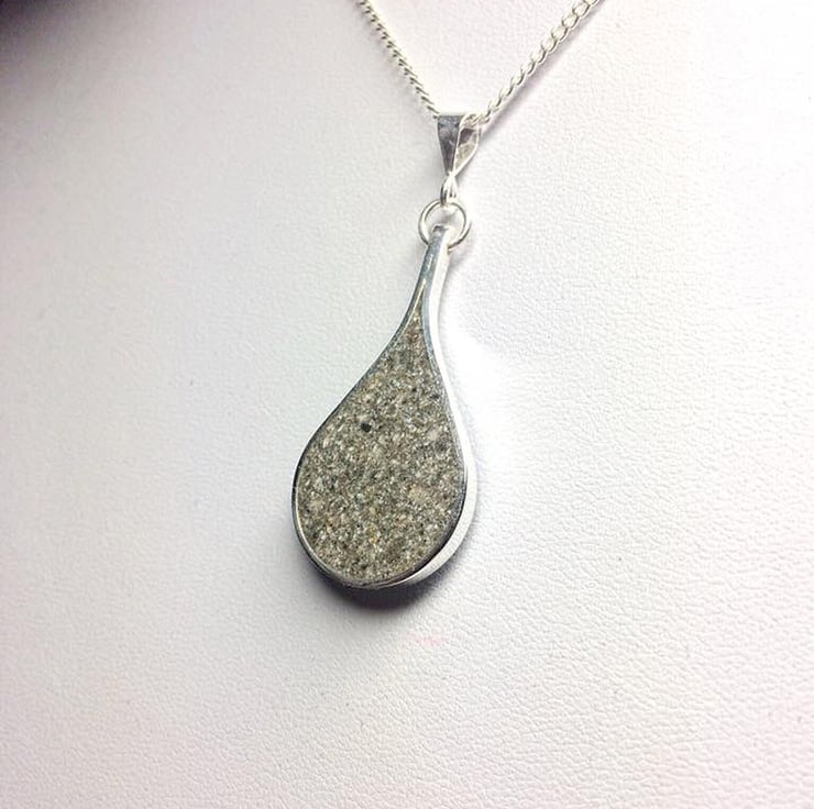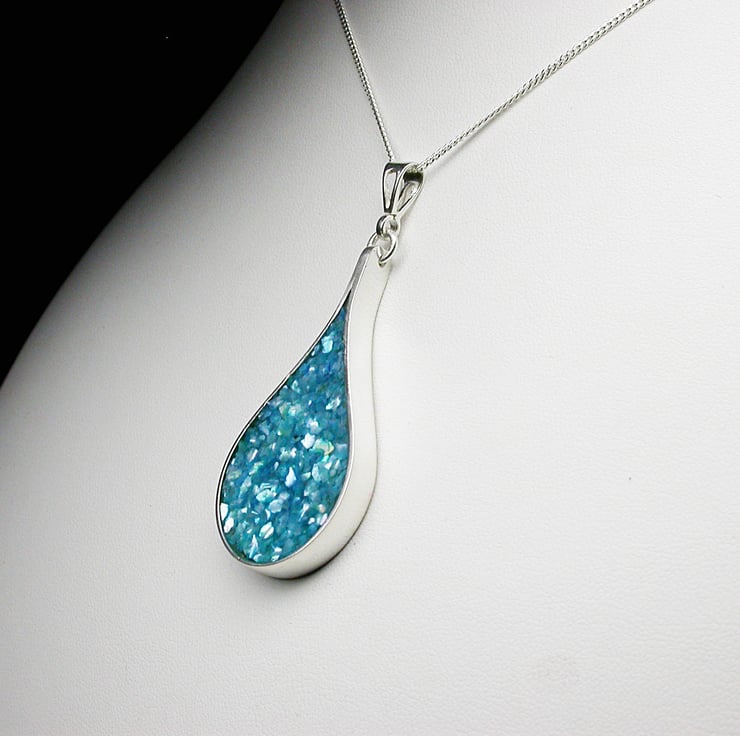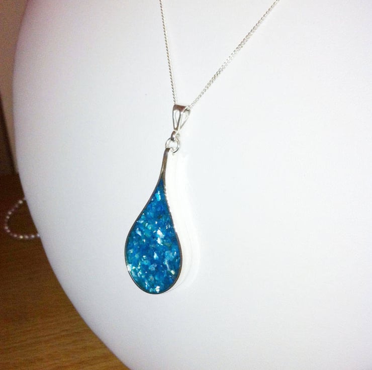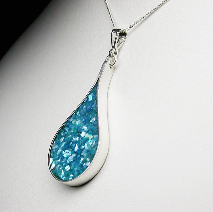 This beautiful Teardrop Pendant Necklace is handmade in highly polished Sterling Silver. The front of the pendant is set with crushed Blue Seashell in a durable hard resin. The reverse can be a flat satin shell finish, or, as part of the Memorial Cremation Ashes Collection, can be set with the Cremation Ashes of a loved, passed relative or pet. The pendant necklace provides a lovely discreet way to keep your most precious memories close. Alternatively, if preferred, the memorial ashes can be mixed with the coloured seashell which provides a mildly flecked appearance, and only you know they are there.