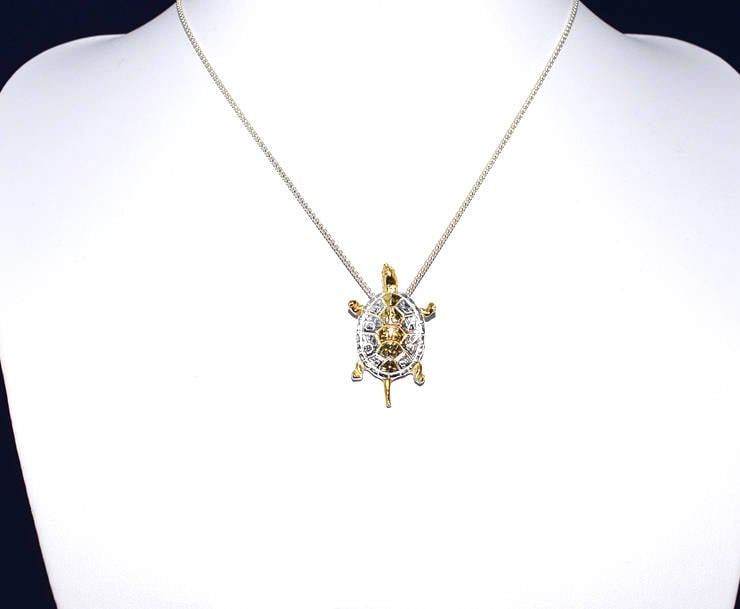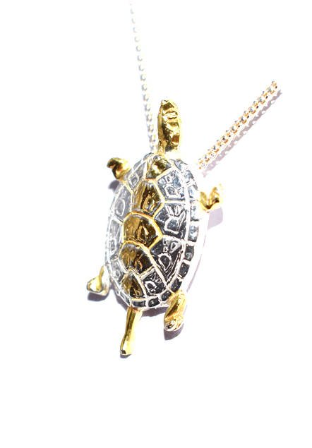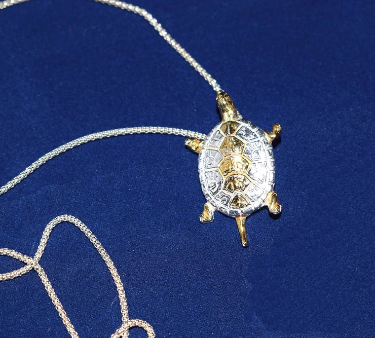 This heavy Fine Silver Turtle is Handcrafted in Silver with 24 carat Gold Highlights. The Turtle is a special piece originally commissioned as one of two commemorative Turtles for a Caribbean Honeymoon. They proved so popular with friends of the commissioner that additional Turtles were made each with slightly different characteristics and highlighting. This is the remaining and largest Turtle in pure Silver. It hangs from a Sterling Silver Popcorn Chain from a hidden Bail.