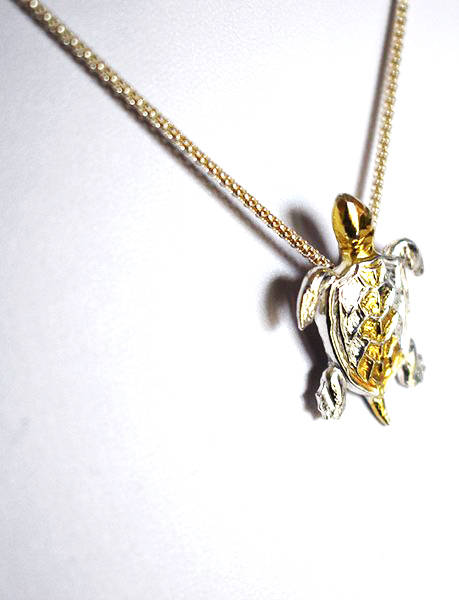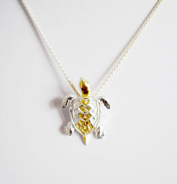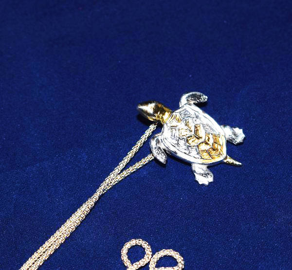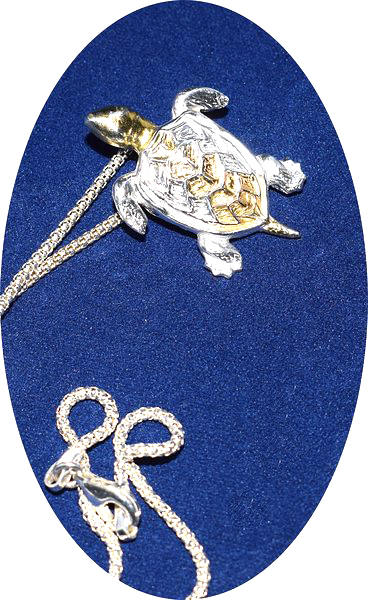This small Silver Turtle is completely handmade in Fine Silver .999. The Turtle is moulded in Silver Clay then completely dried before firing at 850 degrees C for two hours. This burns off the clay binder leaving pure silver behind. This can then be ‘worked’ like any other silver piece. This Turtle is highlighted with 24ct Gold Highlights. It is 3cm high by 2cm at the widest point and weighs 6.72 grams. It comes with a Sterling Silver Popcorn Chain in a Presentation Box. Although below the exemption weight it is still hallmarked for quality with the ‘Fine Silver’ hallmark of the Sheffield Assay Office.