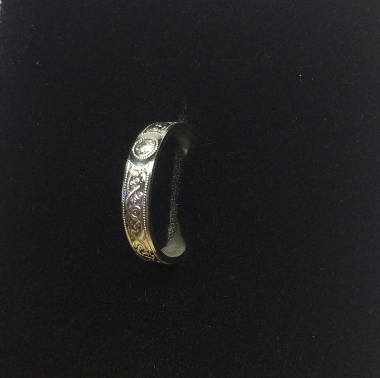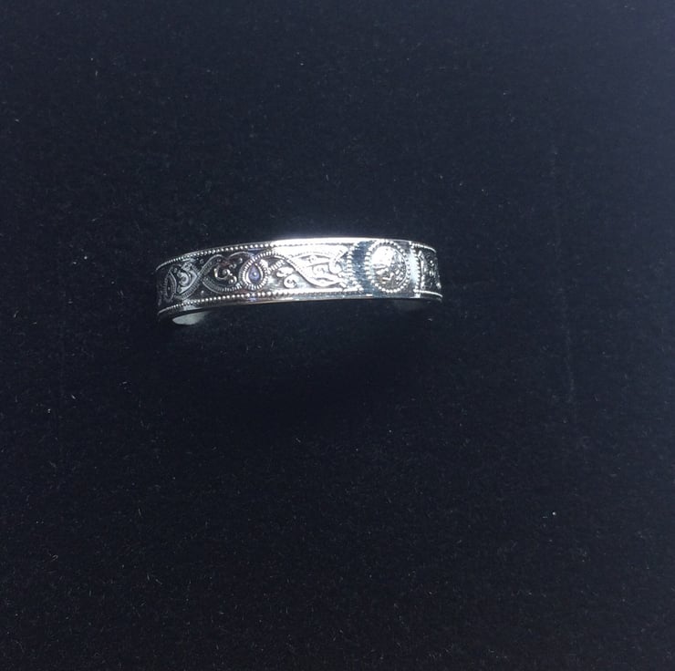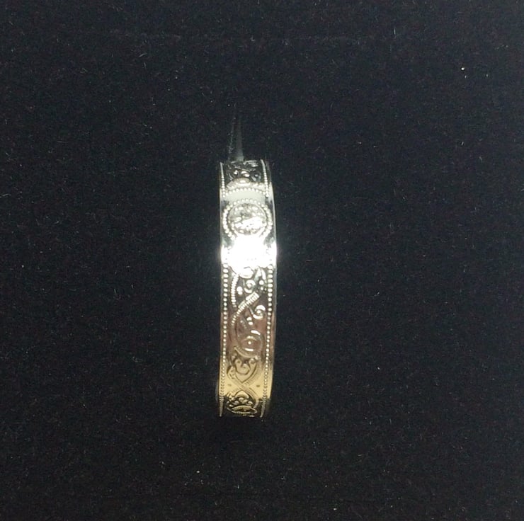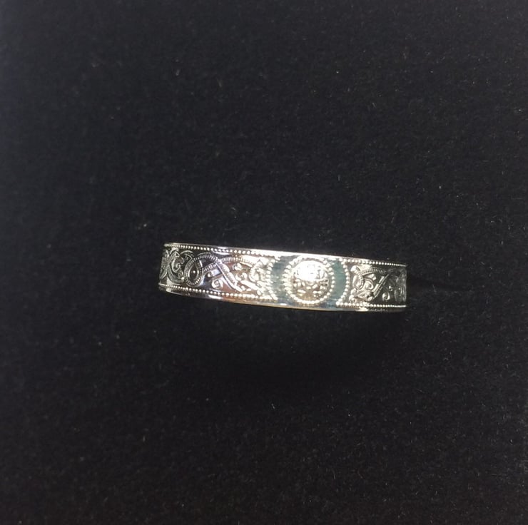 A Patterned Sterling Silver Ring Band with dome and scrolls relief. This ring is open backed so it can be adjusted between sizes available I. The following adjustable sizes UK O to Q12. (US 7,14 - 8,12), UK O to R (US 7,14 - 8,34) and UK Q to T (US 8,14 - 9,34). 9,34). (Gently closing or opening out the back of the ring will allow size adjustment).