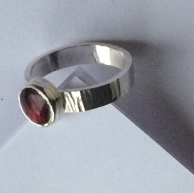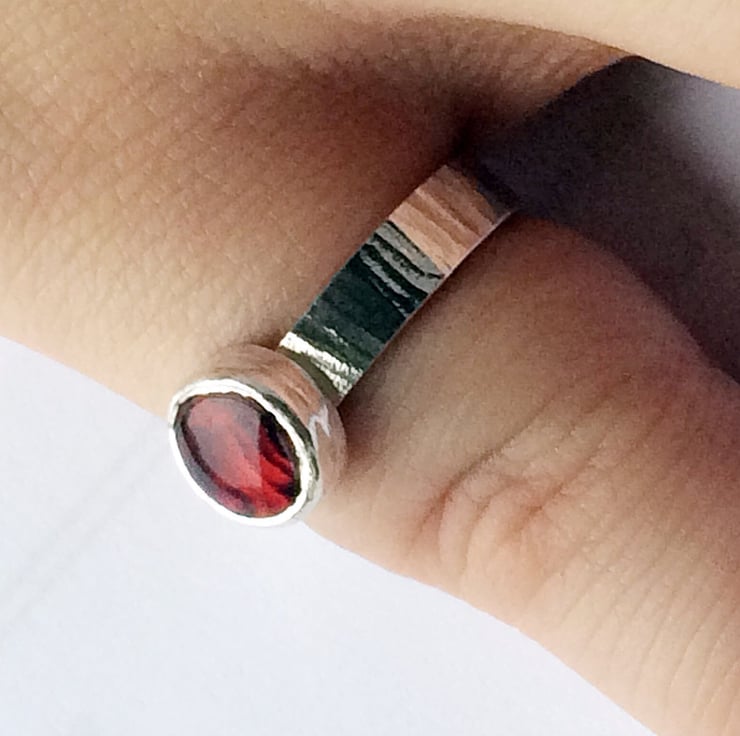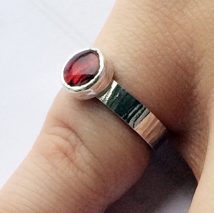 This beautiful Deep Red Paua Shell Sterling Silver Ring sports a hand textured bark effect silver band. The band is 1.4mm thick and 4mm wide, and provides the base for the fine silver Bezel surrounding this unusual stone / shell. The stone shows flashes of deep reds and yellows as the light plays across its surface.