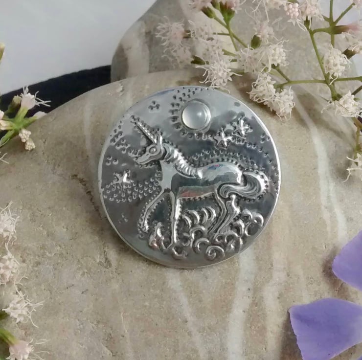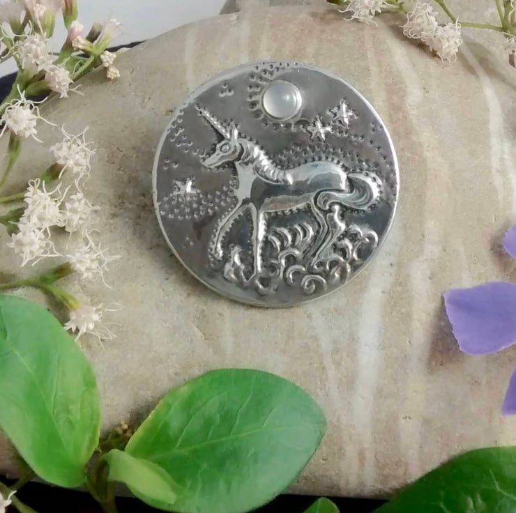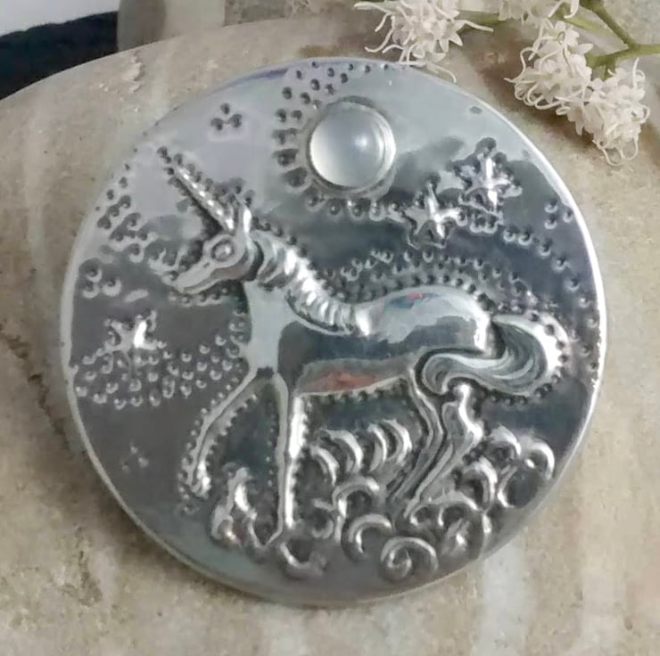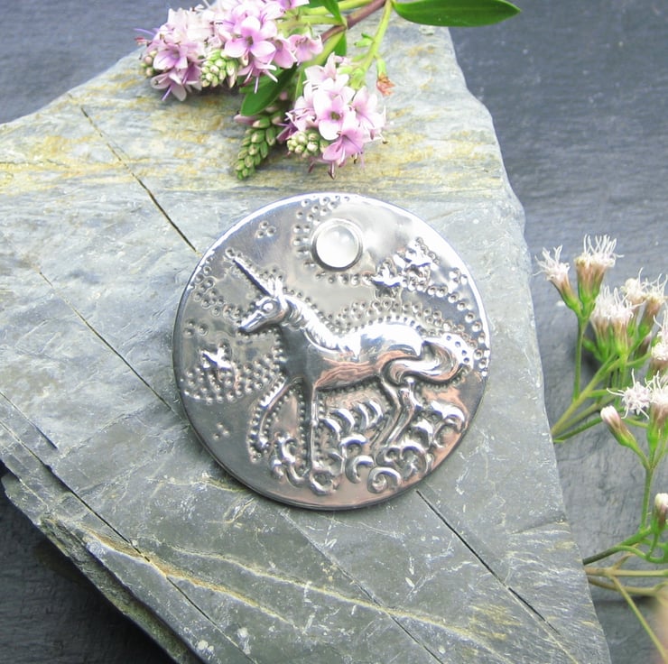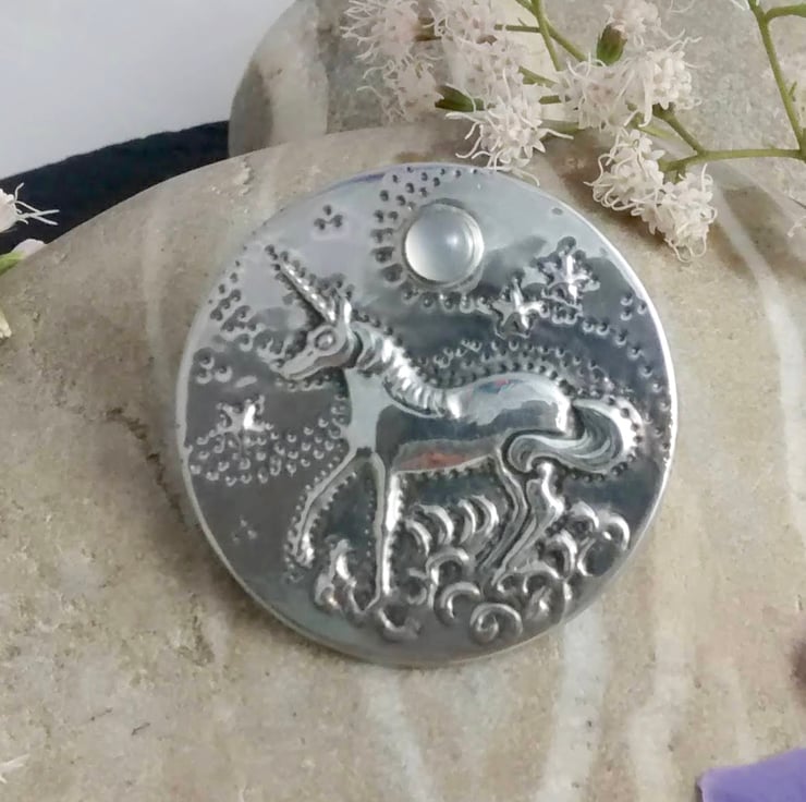 This striking unicorn brooch has been handcrafted in shiny lead-free pewter and set with a genuine moonstone.