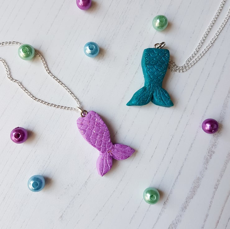 A carefully handcrafted mermaid tail necklace, with complimentary colour glitter and gloss to finish! A very sparkly shiny piece, which would look right at home under the sea!
