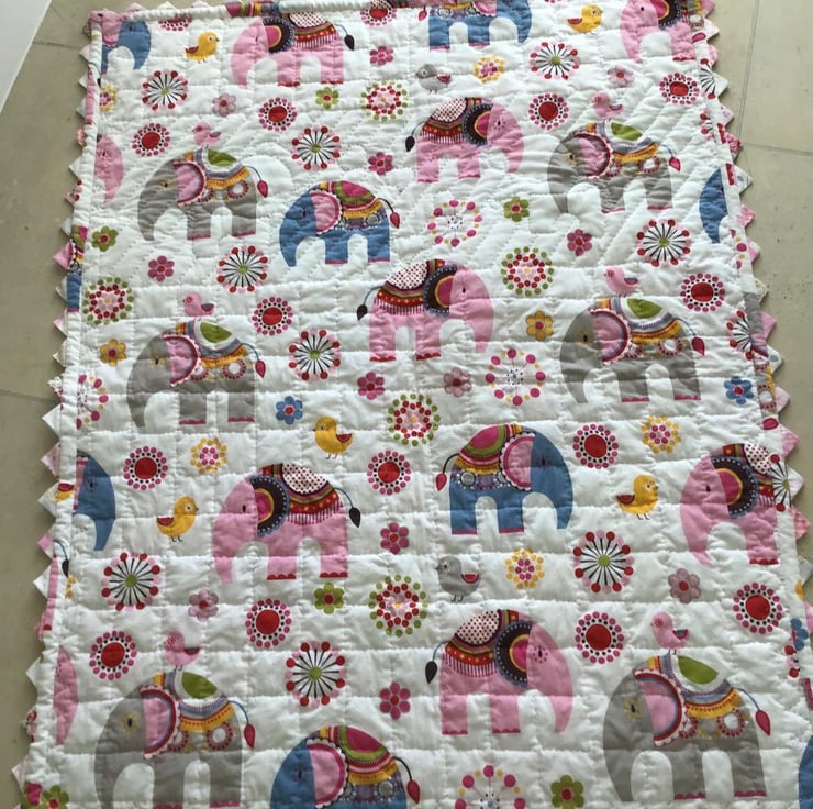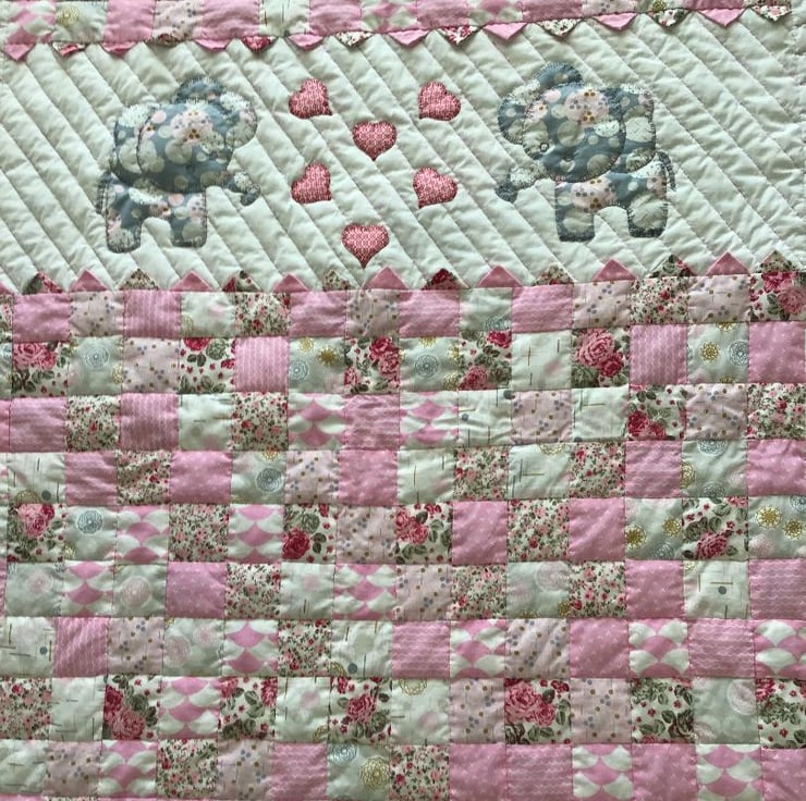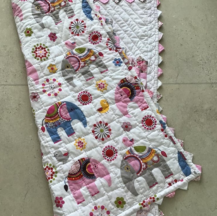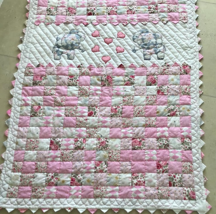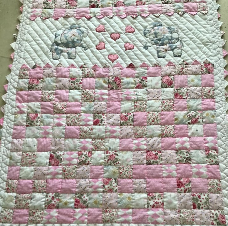 A hand quilted and hand appliqued elephant themed patchwork quilt, it is pink and white patchwork squares with plain white insert three quarters of the way up that I have hand appliqued two grey elephants onto. The back is white cotton with elephants printed on it, and finally I have put my favourite prairie point edge on it.
