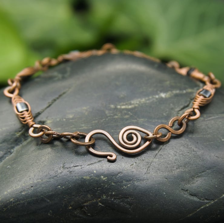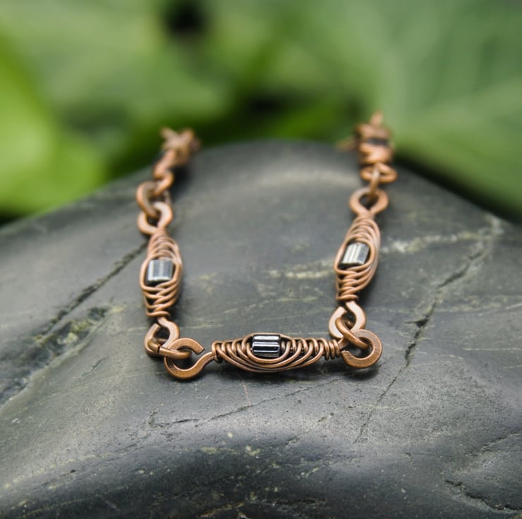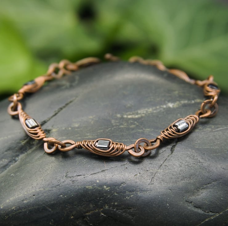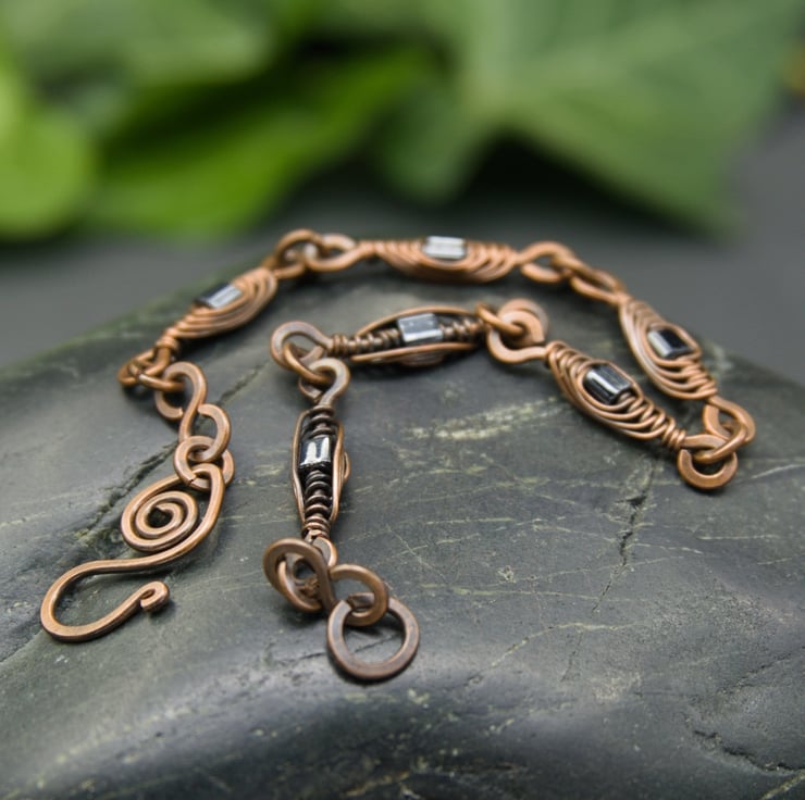This pretty bracelet is entirely handmade from copper wire. I've formed six beaded links by wrapping 4mm cube glass beads with a herringbone weave & joined them with hammered jump rings & figure-of-eight links. The beads are metallic gunmetal grey, which catches the light beautifully.