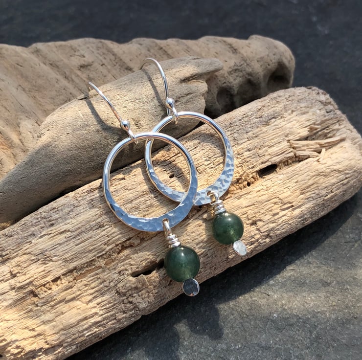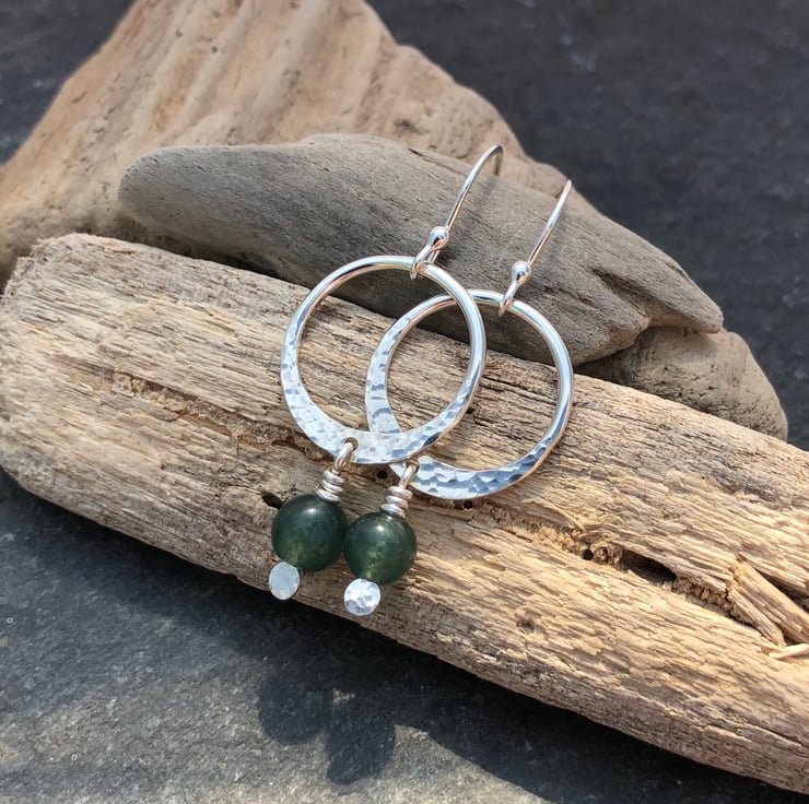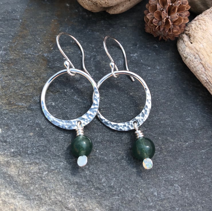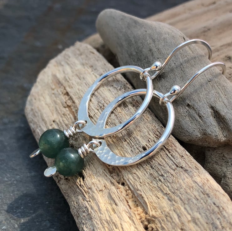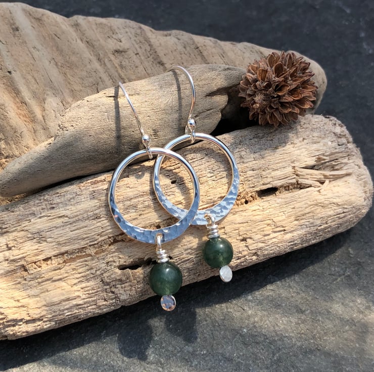 A hoop of sterling silver has been flattened on one side and hammered to add a shiny, dimpled surface texture. A sphere of lovely mossy green agate has been added to the hoop. The agate hangs by a twist of silver wire that is finished with a rounded hammered end to compliment the hoop.