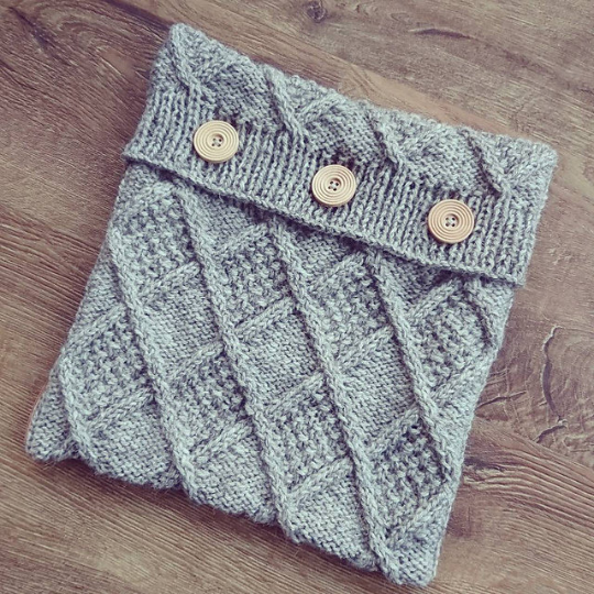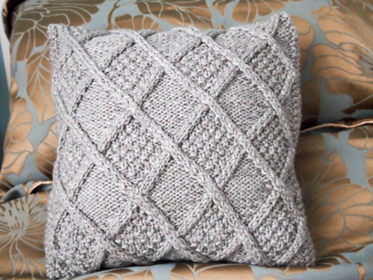 This is an envelope style cushion cover inspired by ganseys and vintage aran patterns. The diamonds represent the “drystane dykes” (dry stone walls) which divides fields all over the north east of Scotland. Worked flat and folded over, it needs 3 buttons to finish.
