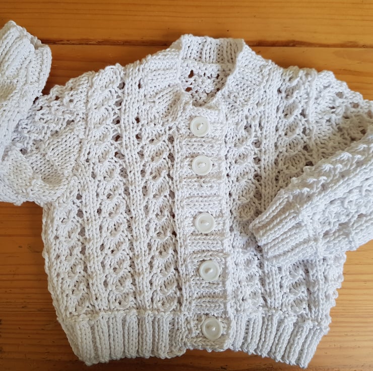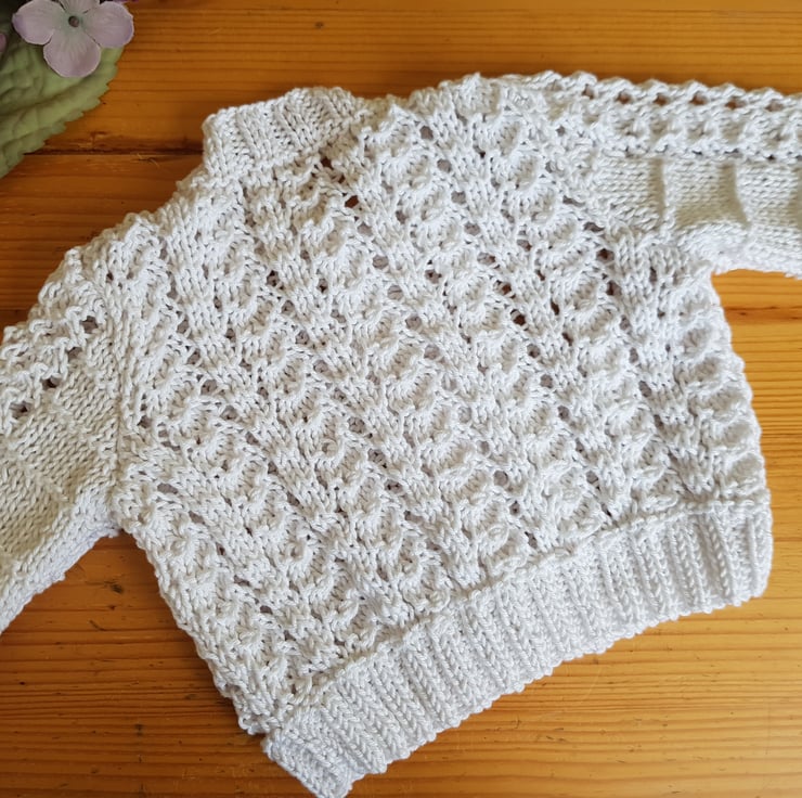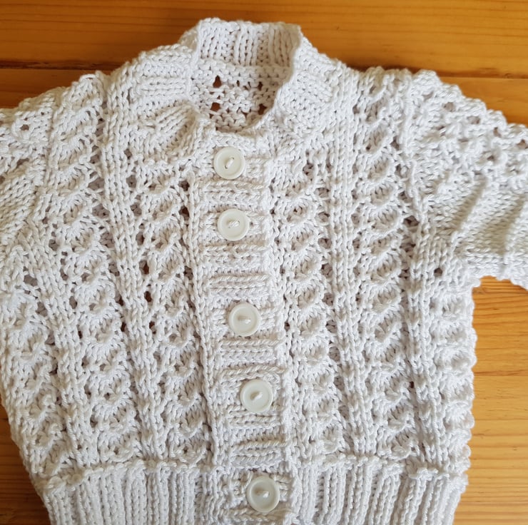 I have hand knitted this pretty little cardigan in pure white soft cotton yarn.