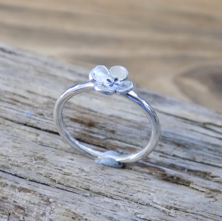 Made from sterling silver sheet and wire. The tiny flower measuring approx. 7mm across has been hand sawn from silver sheet and soldered onto a 1.5 mm hammered shank .This particular size is a UK H, ideal for a child or the little finger.