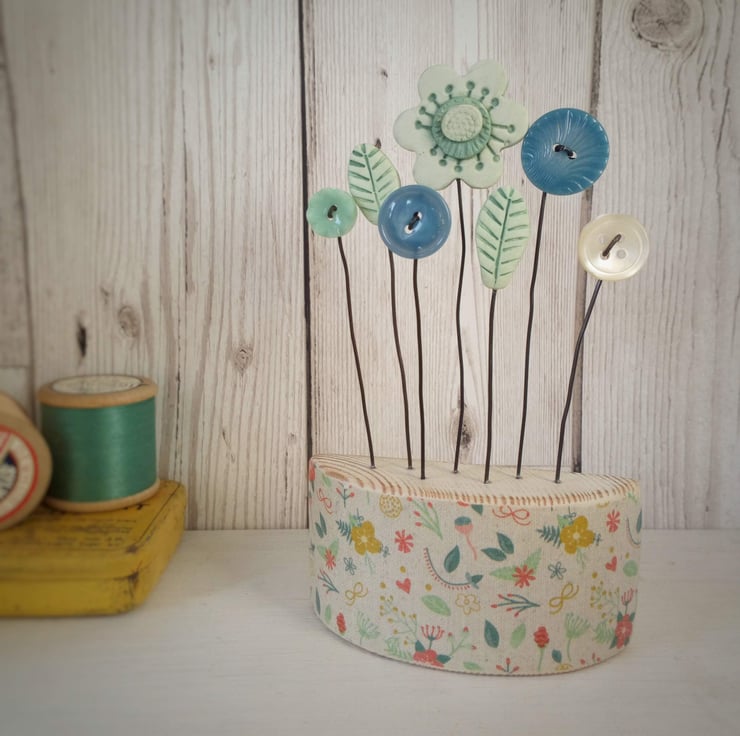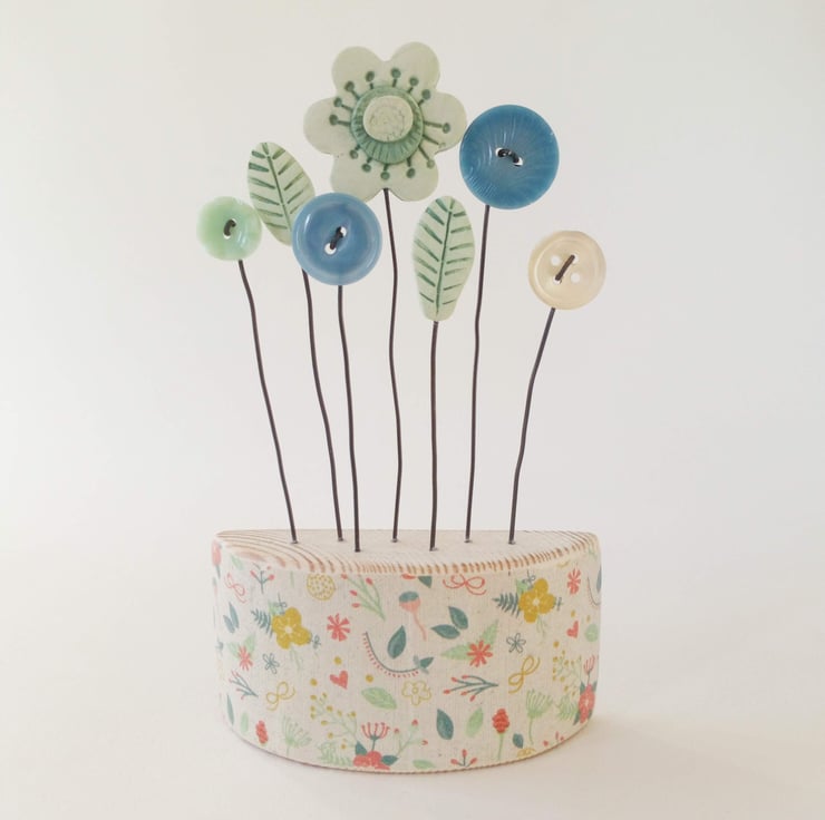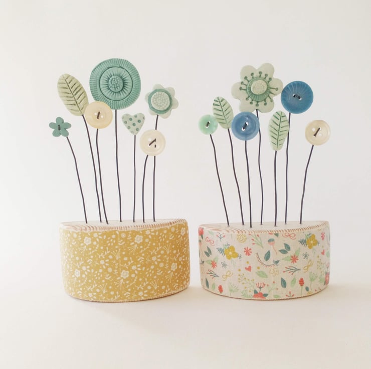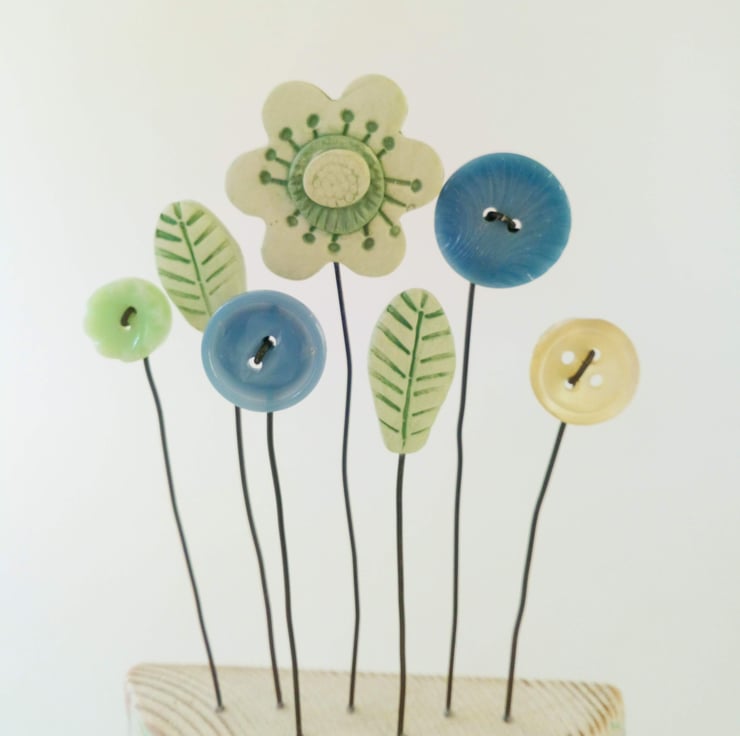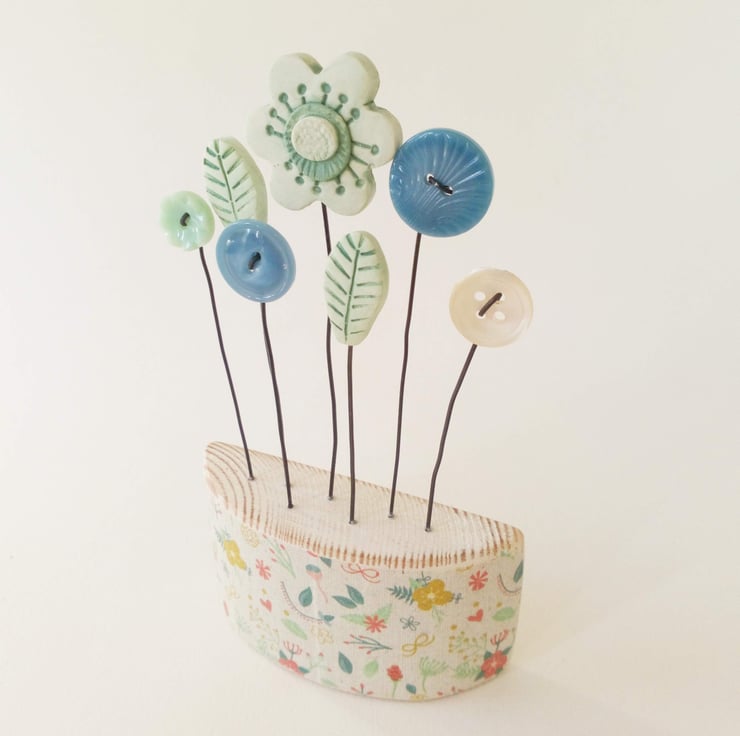 Button and clay flowers grow in this flower garden, standing on their wire stalks in a curved and decoupaged wood block.