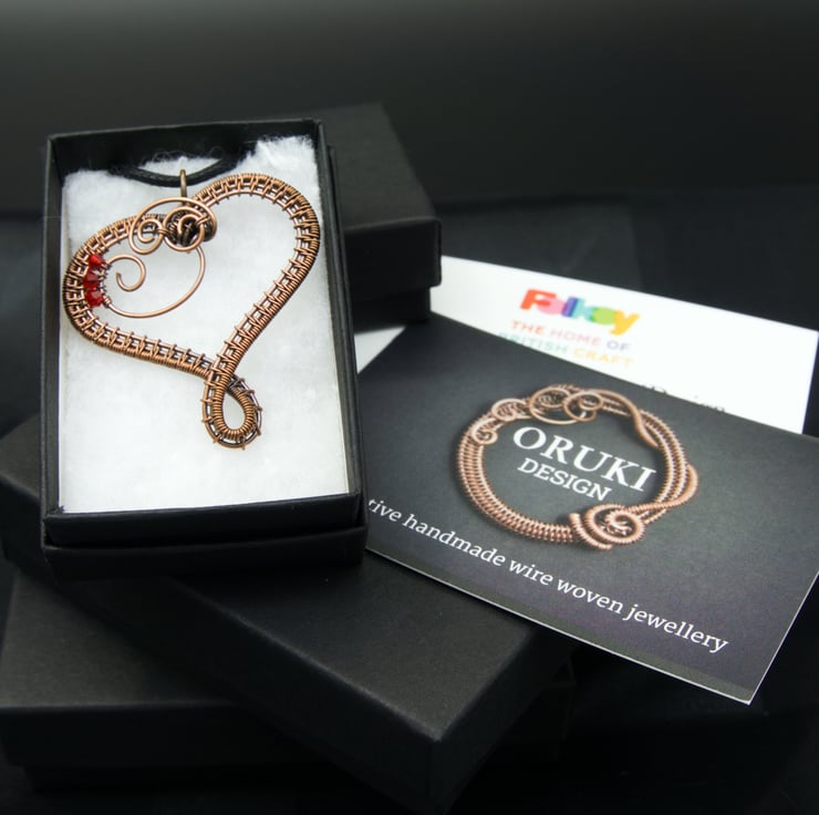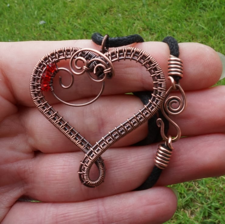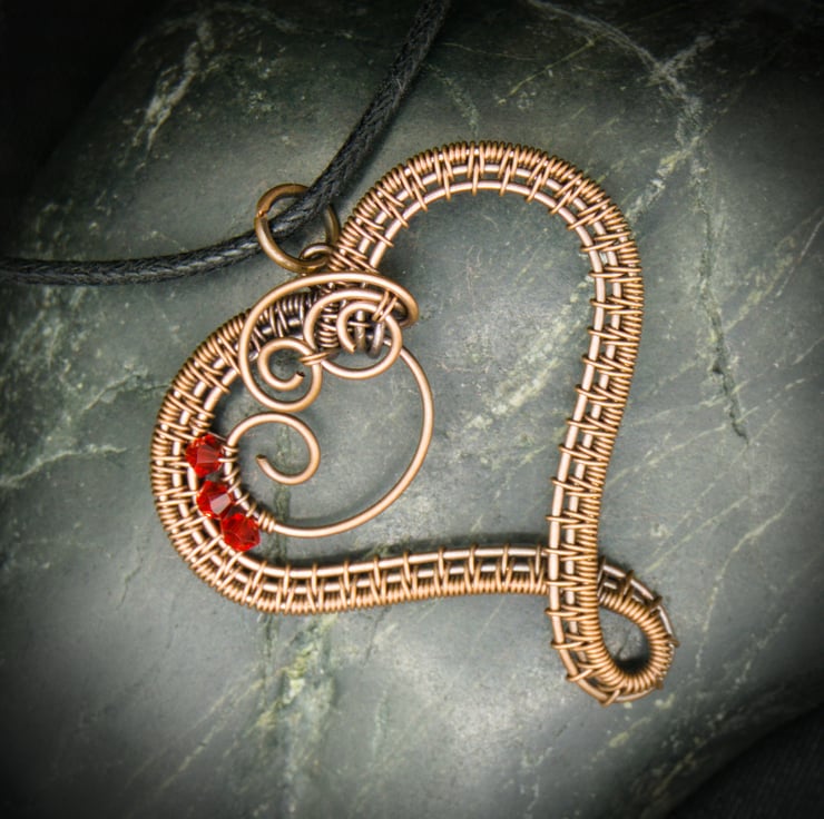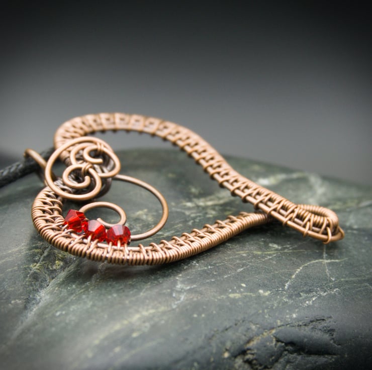 This gorgeous heart pendant has been hand woven from copper wire. Three sections of 0.8mm wire have been laced together using very fine wire with a flame weave to create an intricate pattern around the curves of the heart shape. I've then finished it by spiralling the ends of the wires & adding 3mm Swarovski® crystal bicone beads. These crystals are Light Siam - the birthstone colour for July as it represents Ruby, so it would make a lovely present for a July birthday, or just for someone who loves red!