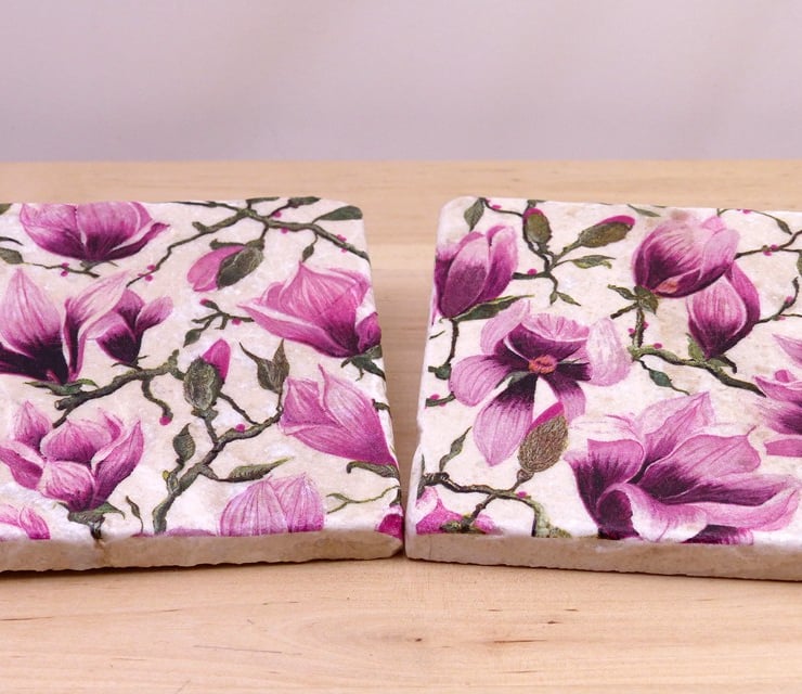 A pair of marble coasters measuring 10cm x 10cm decoupaged with a lovely paper napkin featuring magnolias. The coasters have been coated with lacquer so they can be wiped with a damp cloth and have four plastic feet glued to the base to protect your furniture.