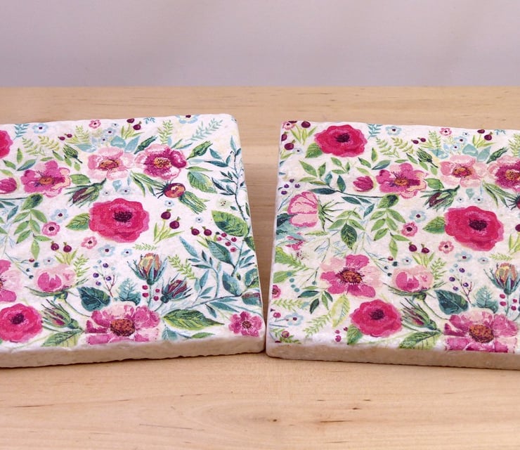 A pair of 10cm x 10cm marble coasters decoupaged with a pretty pink floral paper napkin. The coasters have been coated with lacquer so they can be wiped with a damp cloth and have four plastic feet glued to the base to protect your furniture. Please note that as this item will be made to order, and due to the fact that every stone is unique, the colour and pattern may vary slightly from that illustrated.