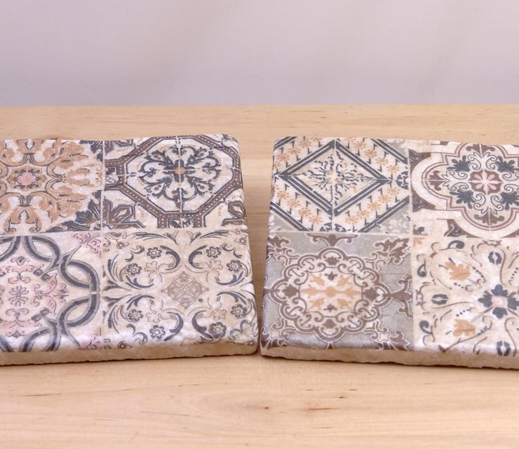 A pair of marble coasters measuring 10cm x 10cm decoupaged with a beige geometric design paper napkin. The coasters have been coated with several layers of a matt lacquer so they can be wiped with a damp cloth (I would not recommend immersing in water) and have four plastic feet glued to the base to protect your furniture. Please note that as this item will be made to order and due to the fact that every stone is unique, the colour and pattern may vary slightly from that illustrated.