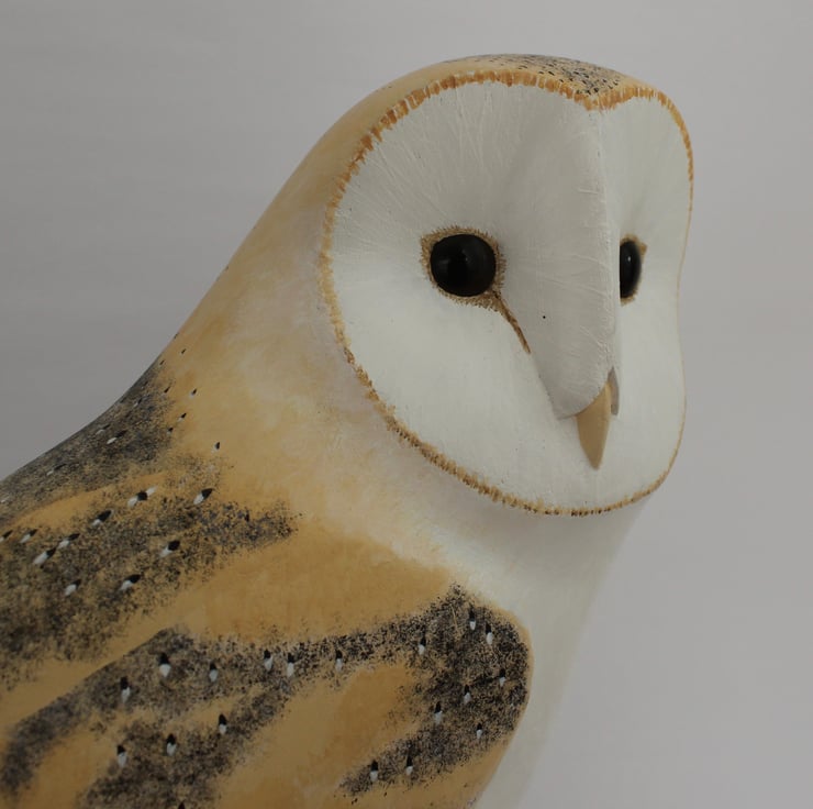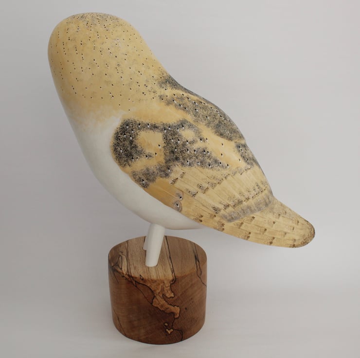 This is a large hand carved barn owl mounted on a lovely piece of spalted beech. It has hand tinted glass eyes and I have painted it with artists acrylics and then finished it to a soft shine with wax. Apart from cutting the original blank, all of my birds are carved with a hand knife...no electrical carving tools are used.