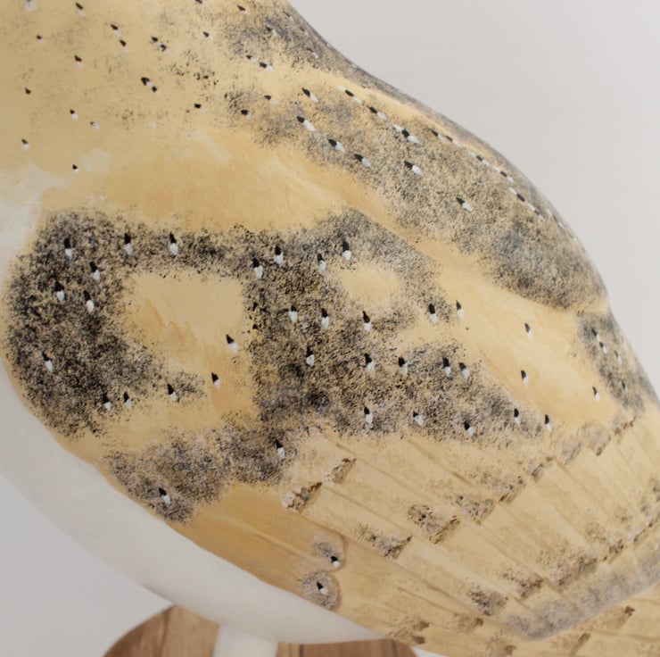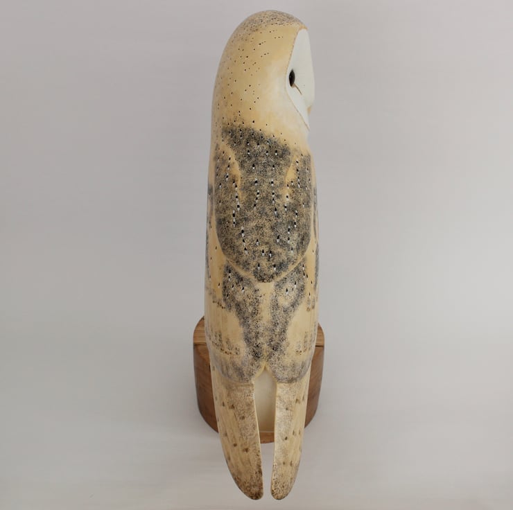 This lovely owl is life size in profile but is narrow in depth so it will fit comfortably on a shelf. The piece is 31.5cm tall and 28cm across. The owl is 8cm deep and the base is 10.5cm in diameter.