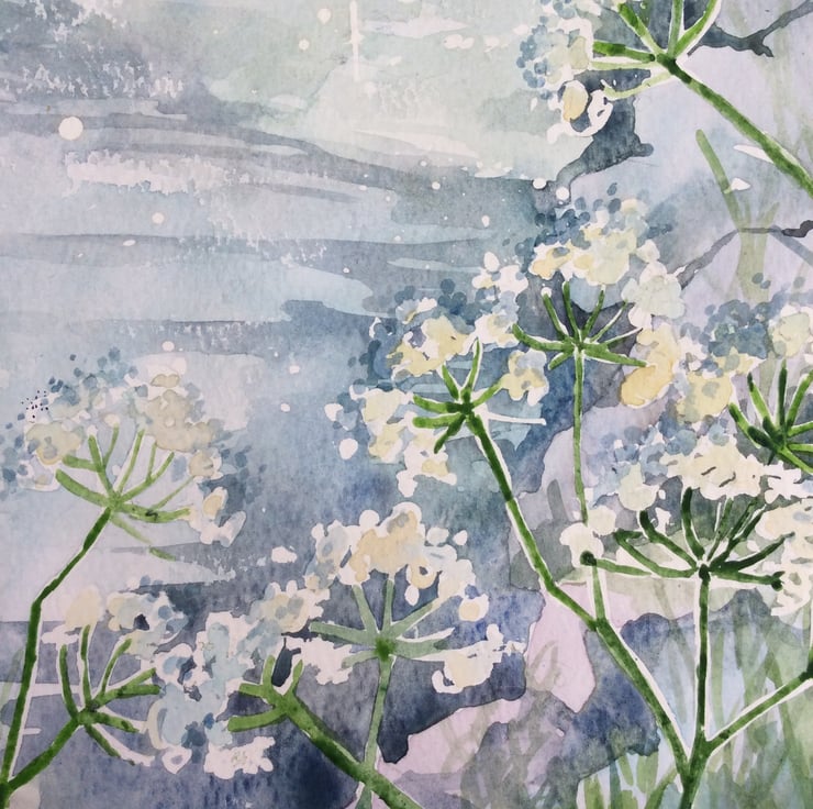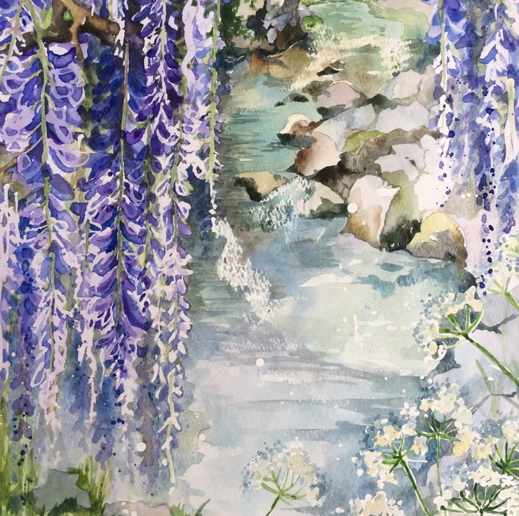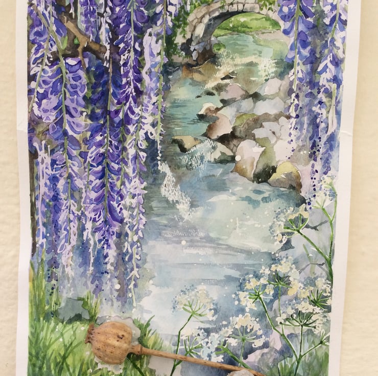 I specialise in creating handpainted greeting cards and original watercolour paintings which are all original artwork and not prints. This bright and vibrant painting depicts purple wisteria flowers and cow parsley overhanging a stream with a stone bridge in the background. Large wisteria flowers can be seen in the foreground but the flowers become more impressionistic as they recede into the background. I use a range of watercolour techniques such as wet on wet, wax resist and splattering to create my unique style of artwork. The painting has been signed and has a 1cm border so you don’t lose any of the beautiful painting when mounting and framing. The measurements are approximately A3 and the painting has been painted on acid free watercolour paper. I post my paintings first class recorded delivery, flat packed and not rolled. Thank you for looking at my work.