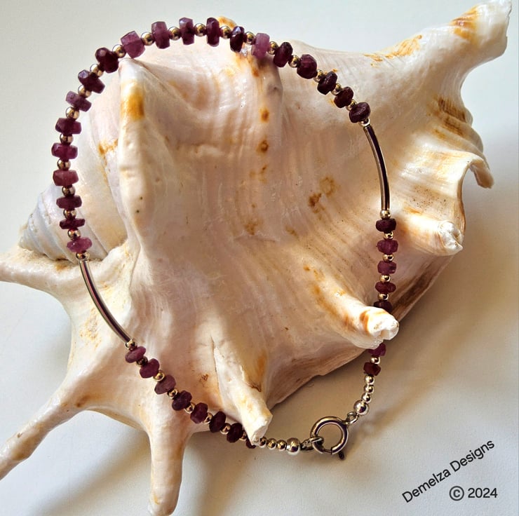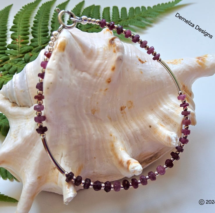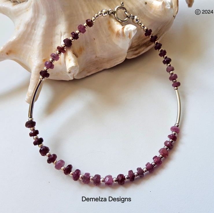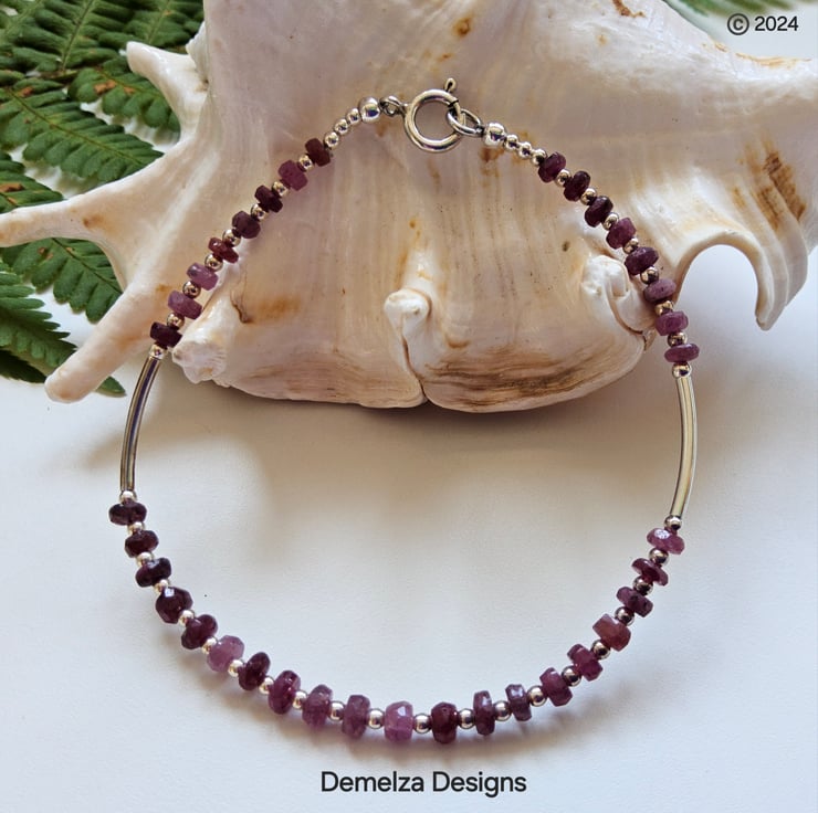 A sweet delicate looking bracelet designed and hand crafted in Cornwall using genuine free faceted ruby gemstone rondelles. Between each gemstone are 2mm sterling silver spacer beads with two heavy weight sterling silver tubes.
